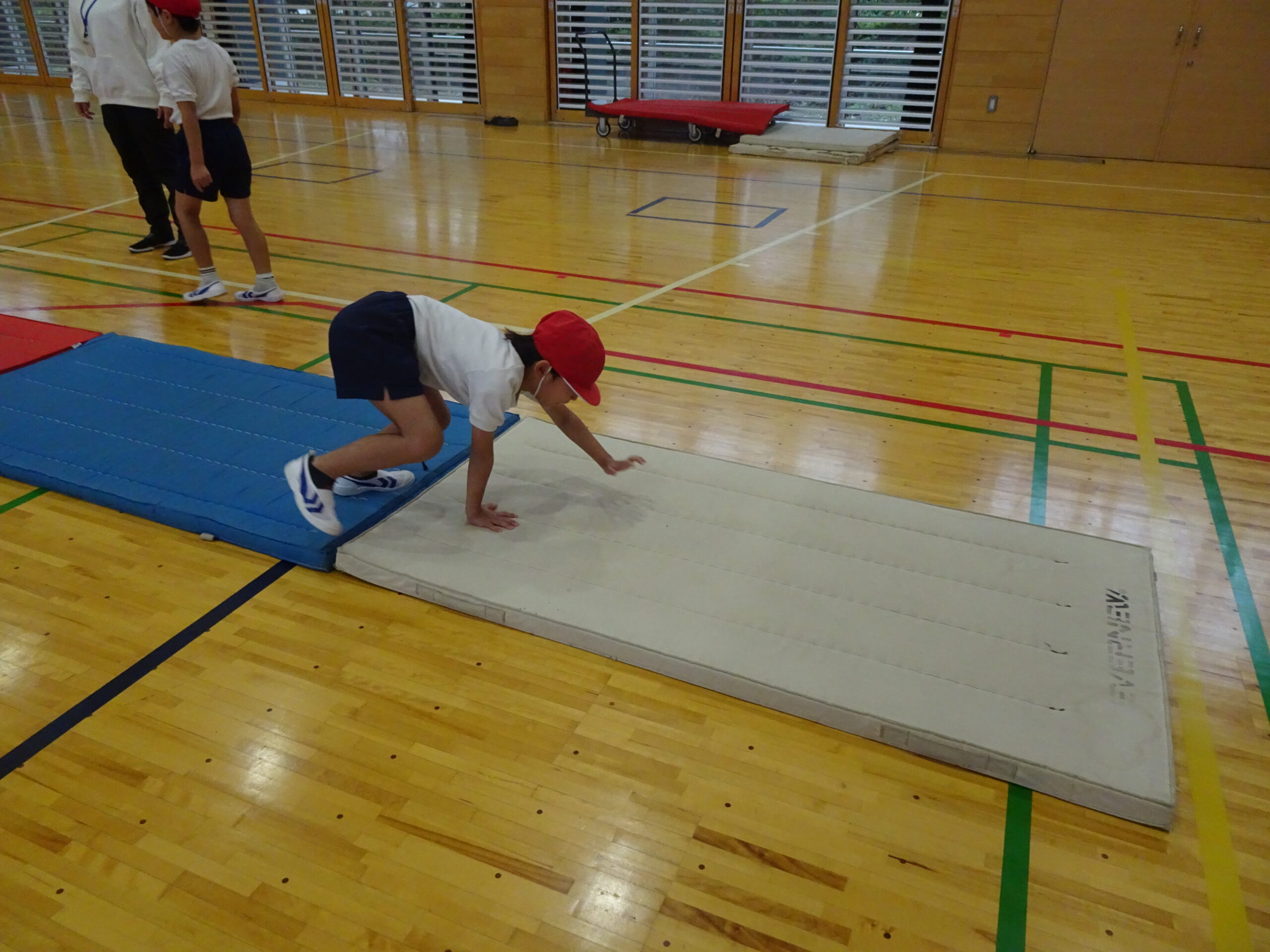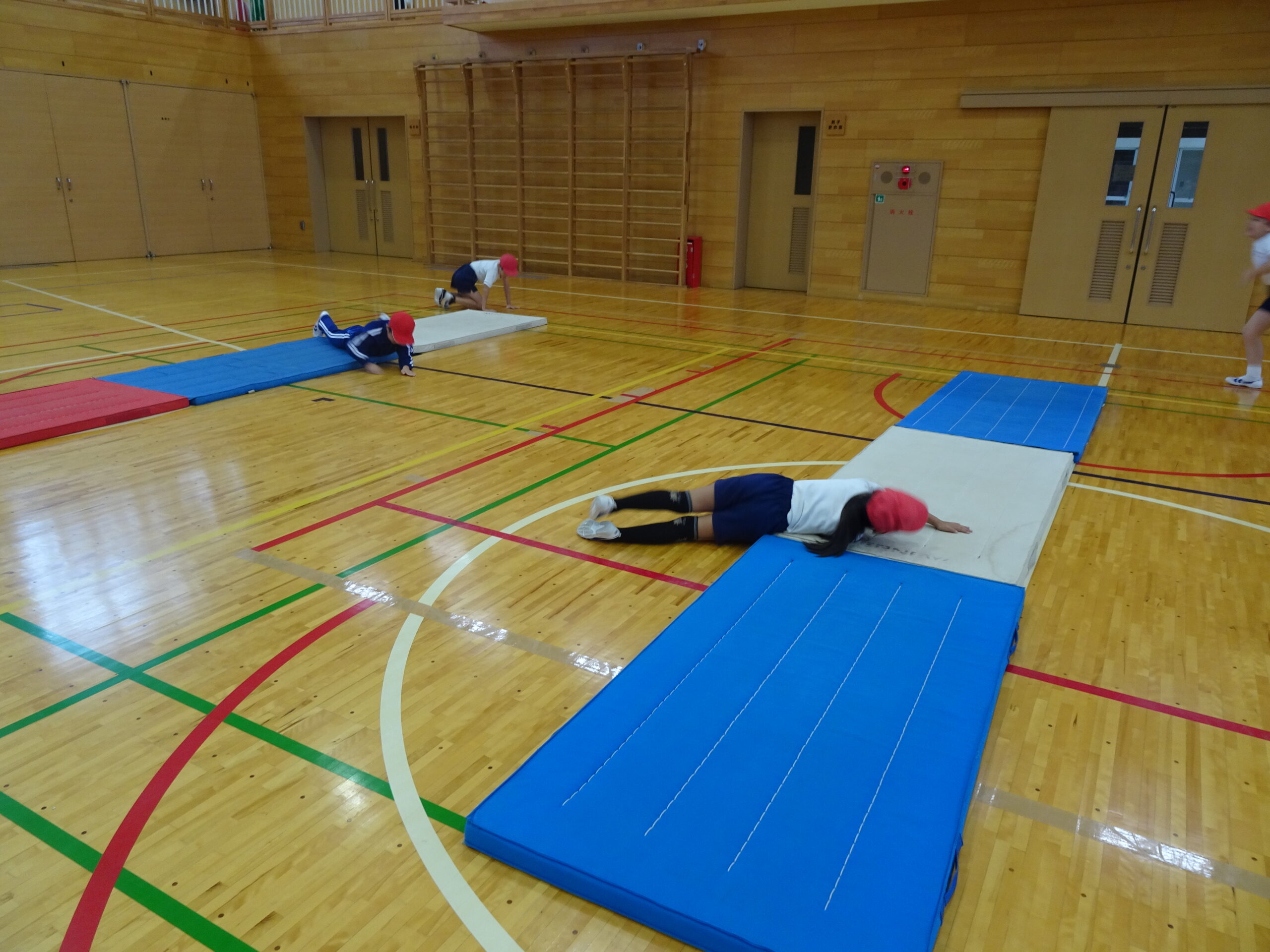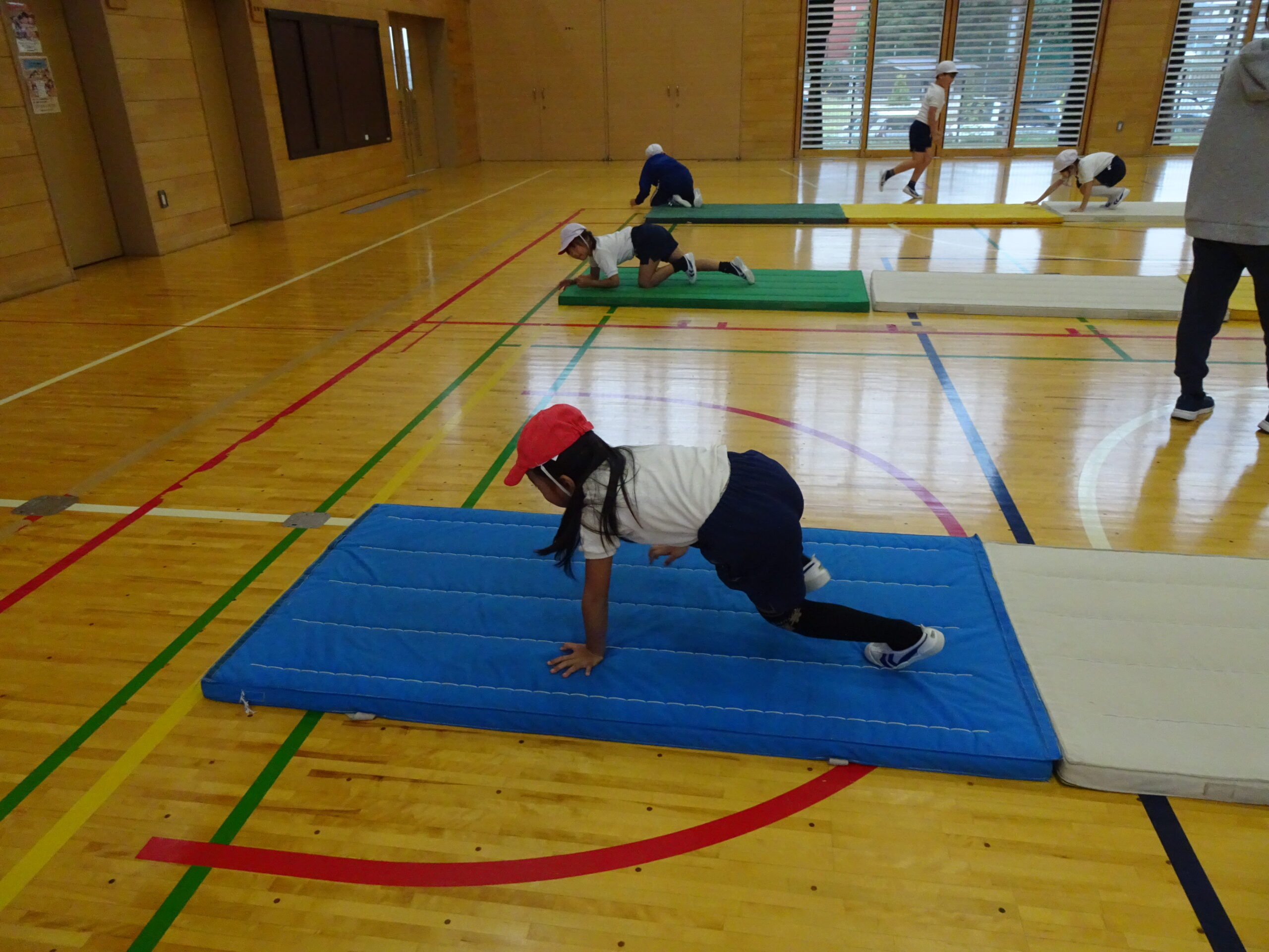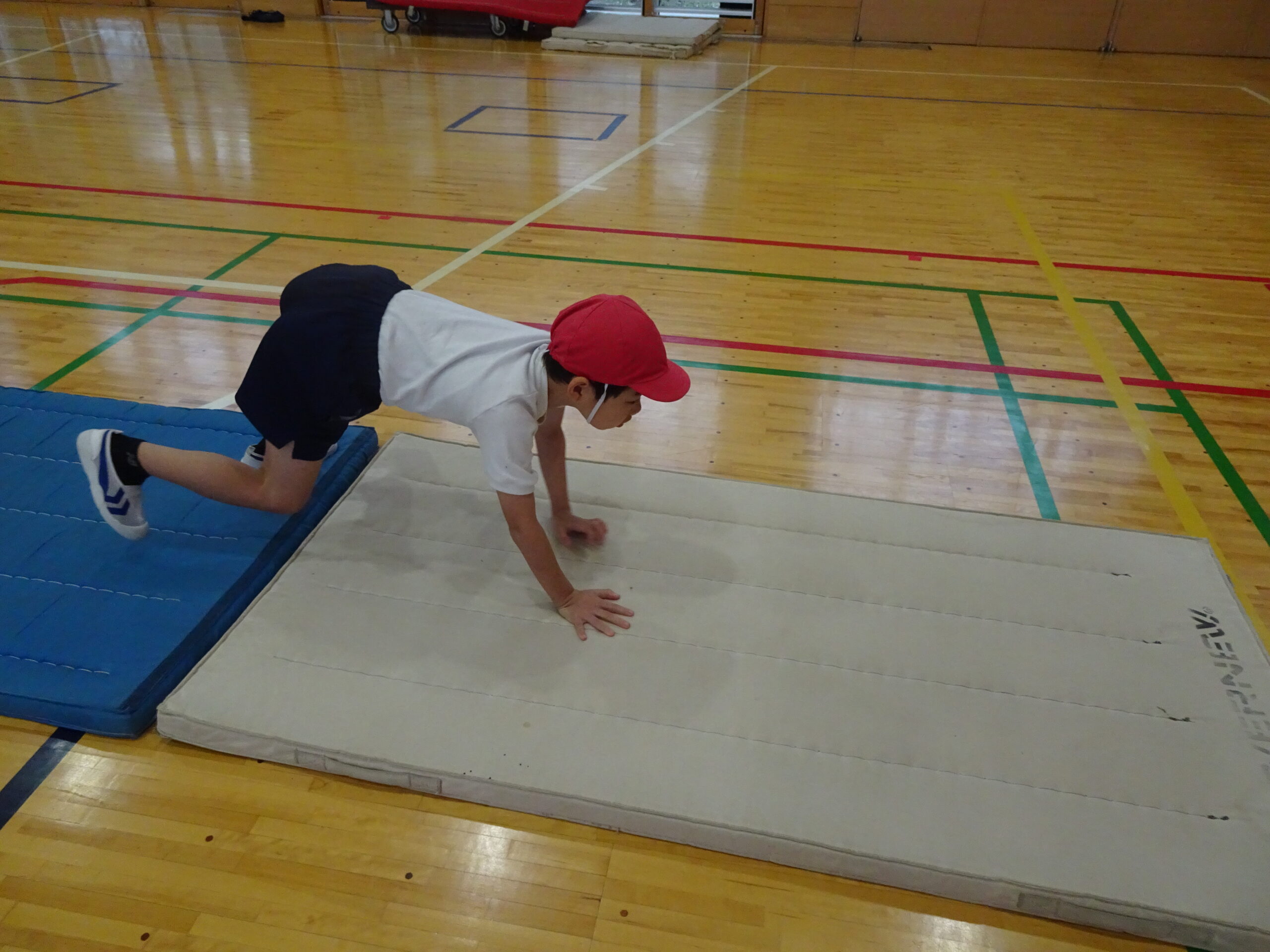体育で、マットを使った学習を行っています。 動物になったつもりで、「くま歩き」「犬歩き」「だんごむし」で マットの上を歩いたり、転がったり・・・ 「丸太転がり」でマットの上を転がったりといろいろな動きを行っています。 体育カードを見て動きを確認しながら進めています。