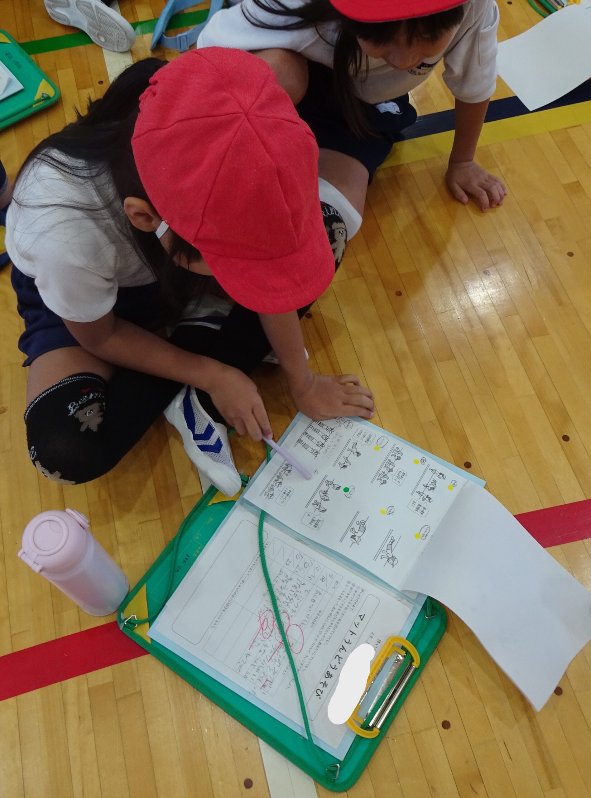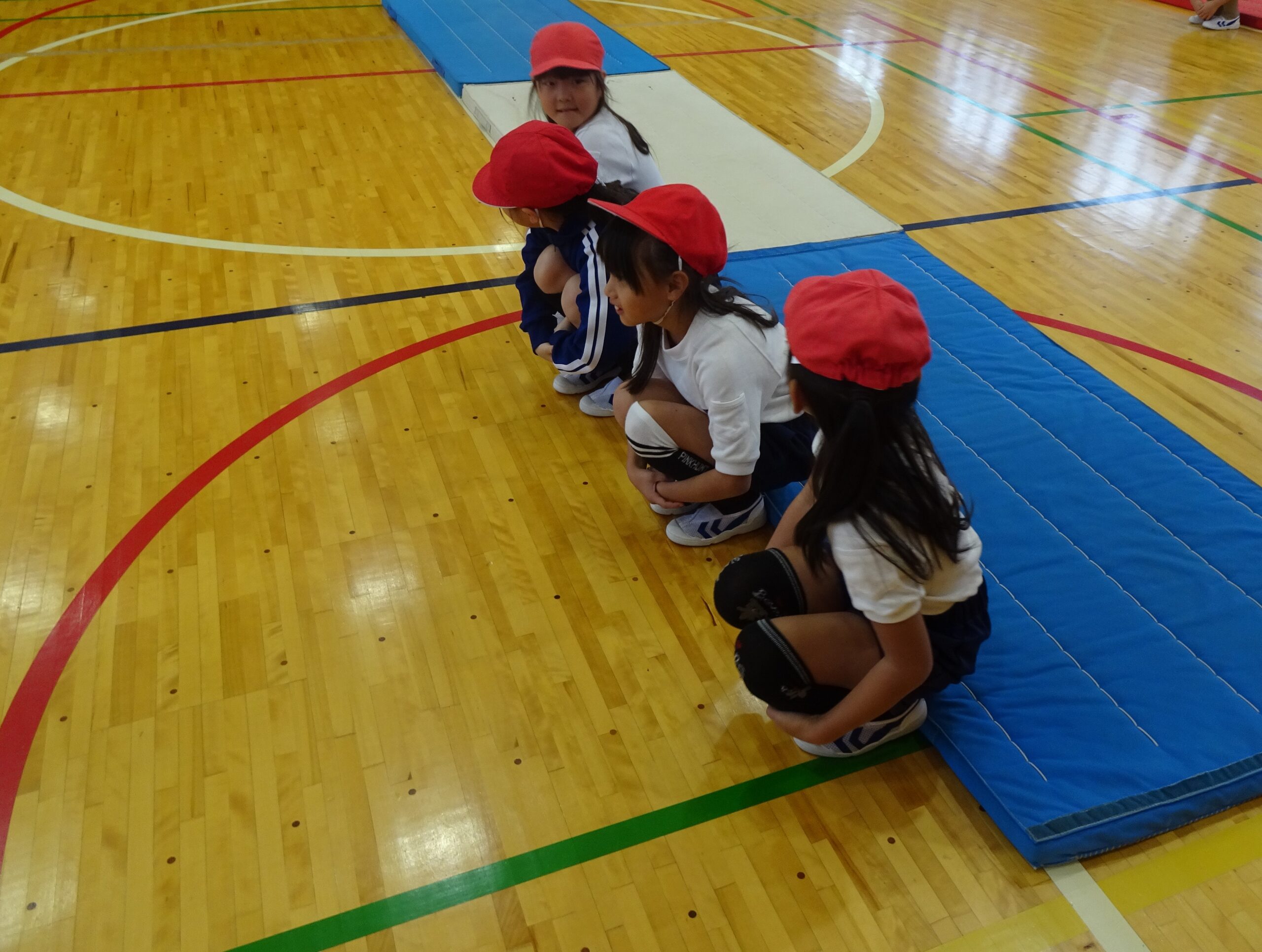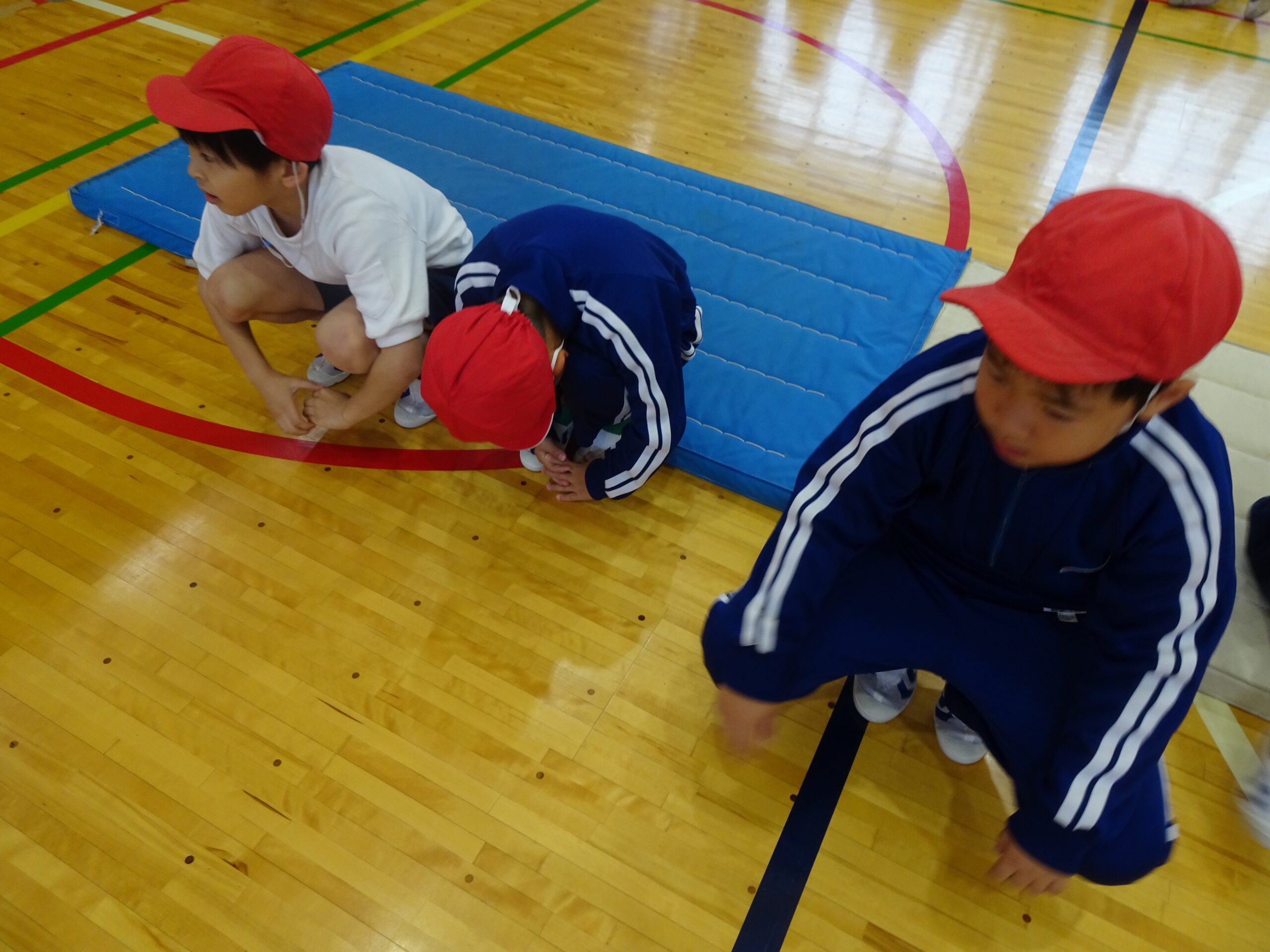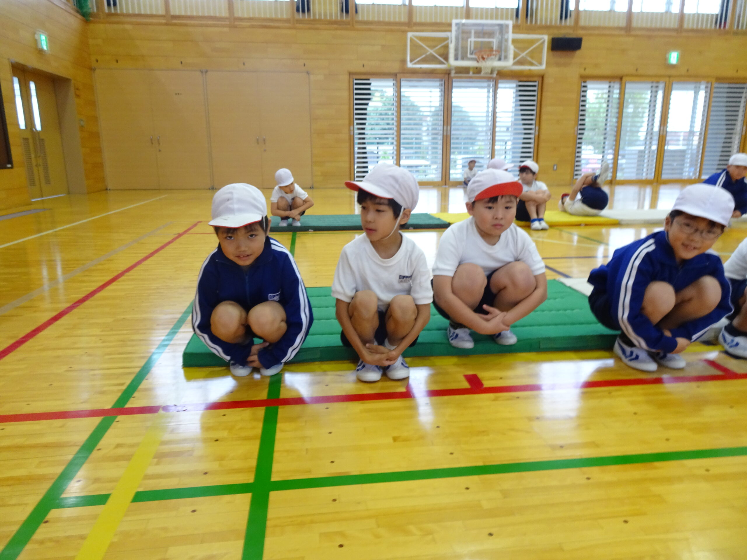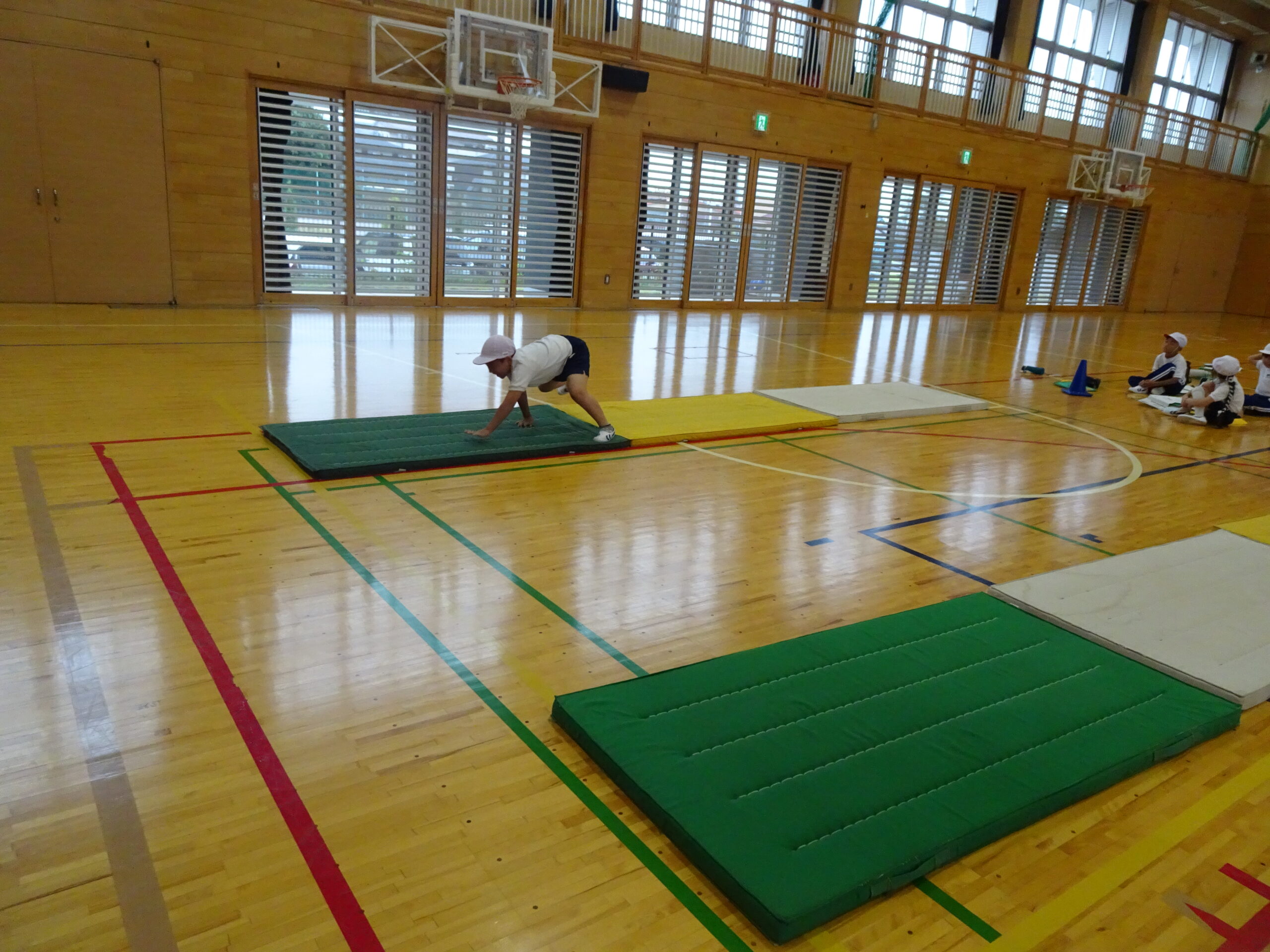 体育で、マットを使った学習を行っています。 動物になったつもりで、「くま歩き」「犬歩き」「だんごむし」で マットの上を歩いたり、転がったり・・・ 「丸太転がり」でマットの上を転がったりといろいろな動きを行っています。 体育カードを見て動きを確認しながら進めています。