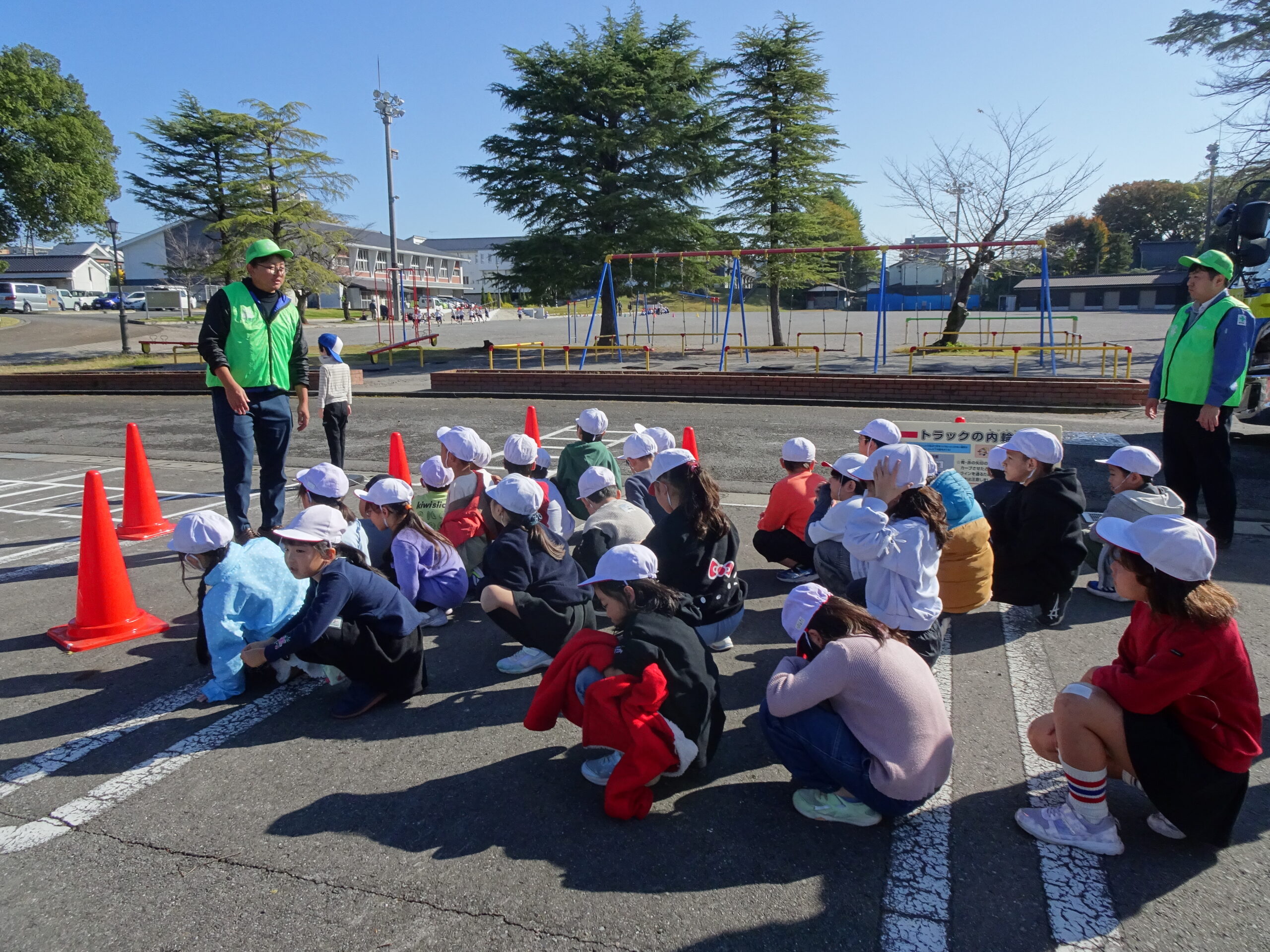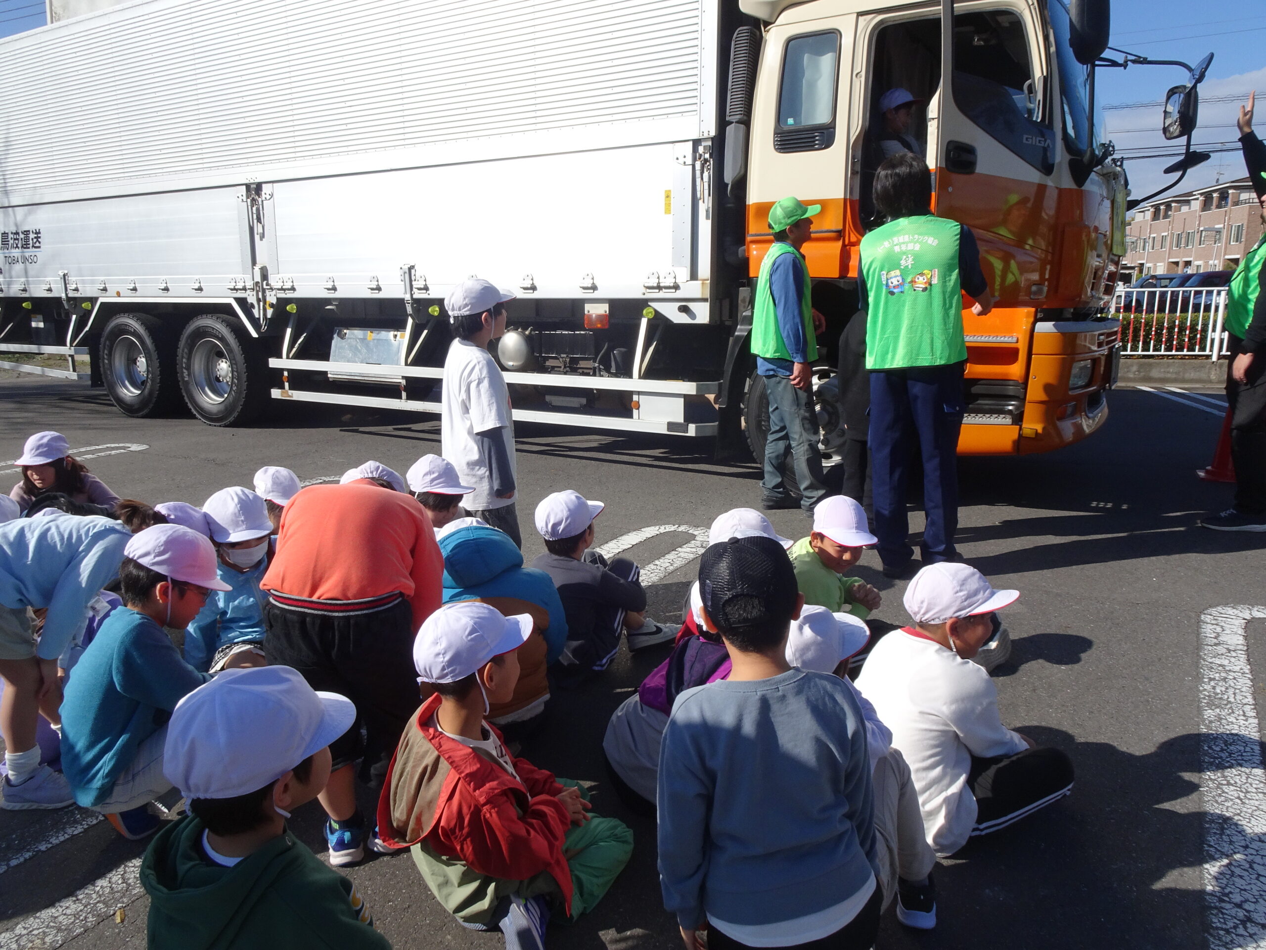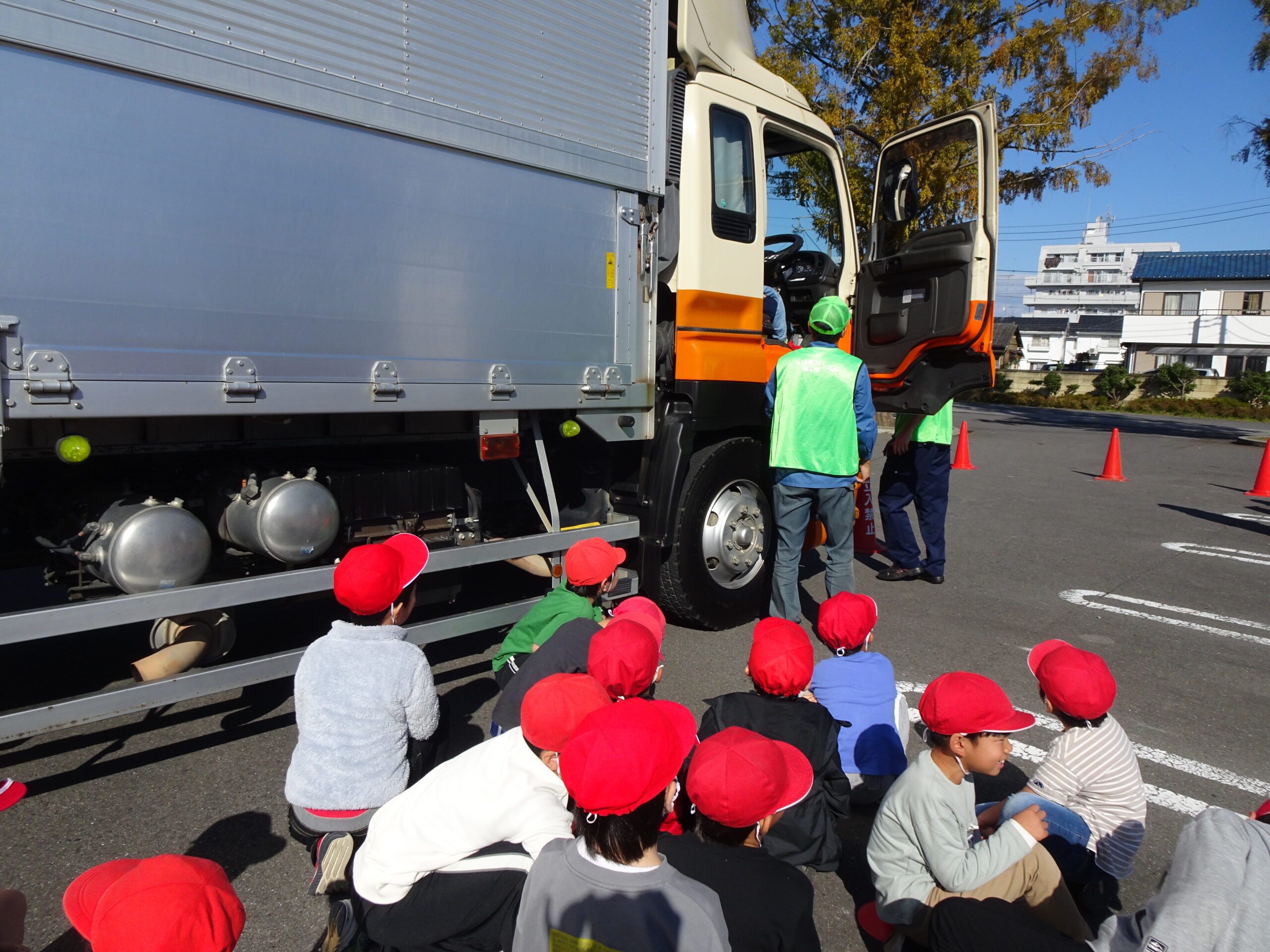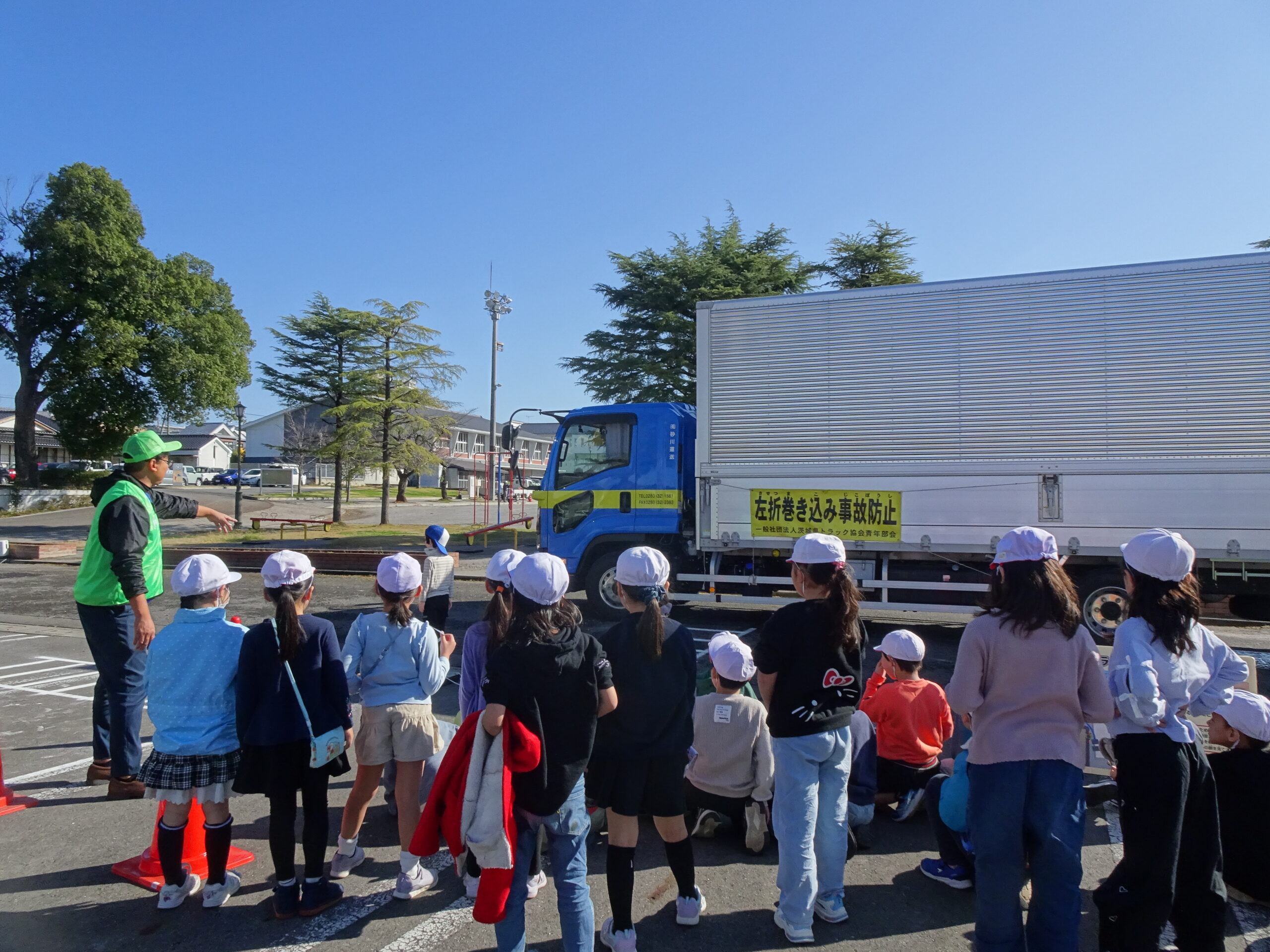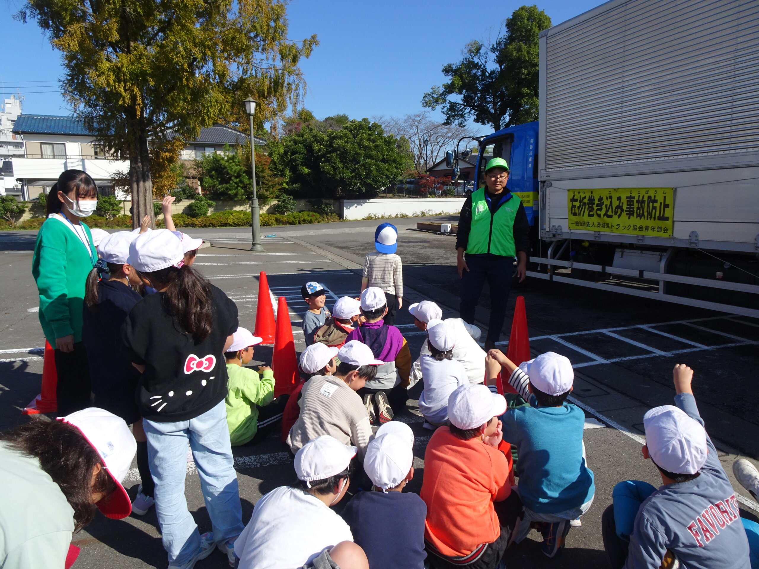 トラック協会の方々に交通安全についてお話を聞きました。 「内輪差」や「死角」といった難しい言葉を、実際にトラックを走らせていただいたり、運転席に乗ったり体験することで、横断歩道でも前にいすぎては危ないこと、運転席から見えない部分があるということを学習することができました。 トラックの荷台に実際に乗ってみると、「高かった」「広かった」との感想がありました。 運転席に実際に乗った感想では、「確かに見えない部分があった」「乗るのが大変」などがありました。 あらためて、交通安全の大切さや登下校で気をつけて歩いていくことを実感する時間となりました。