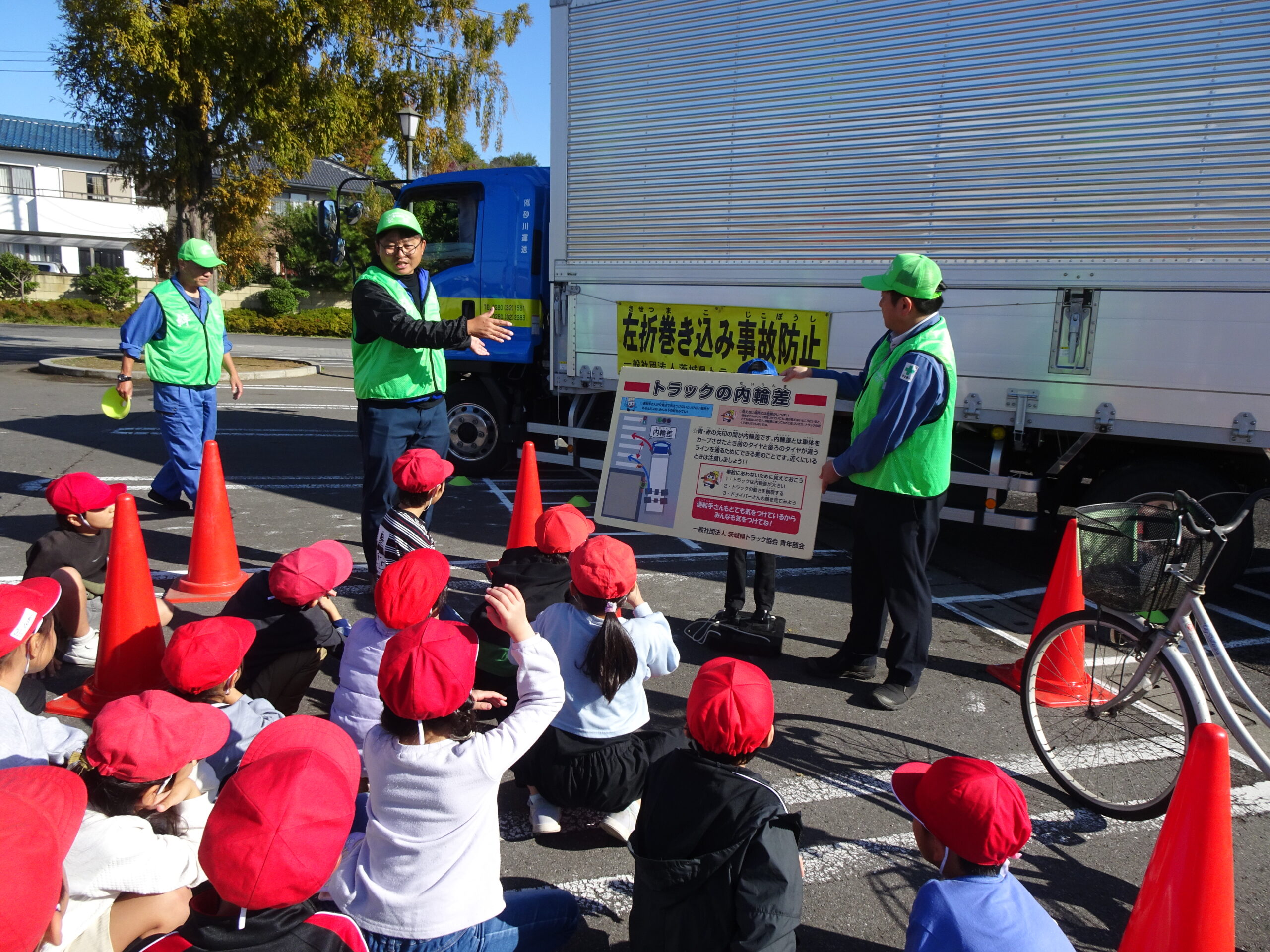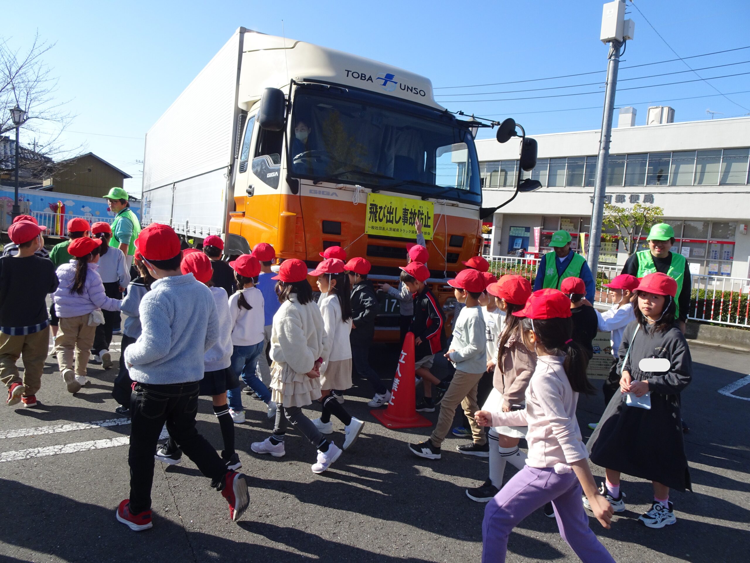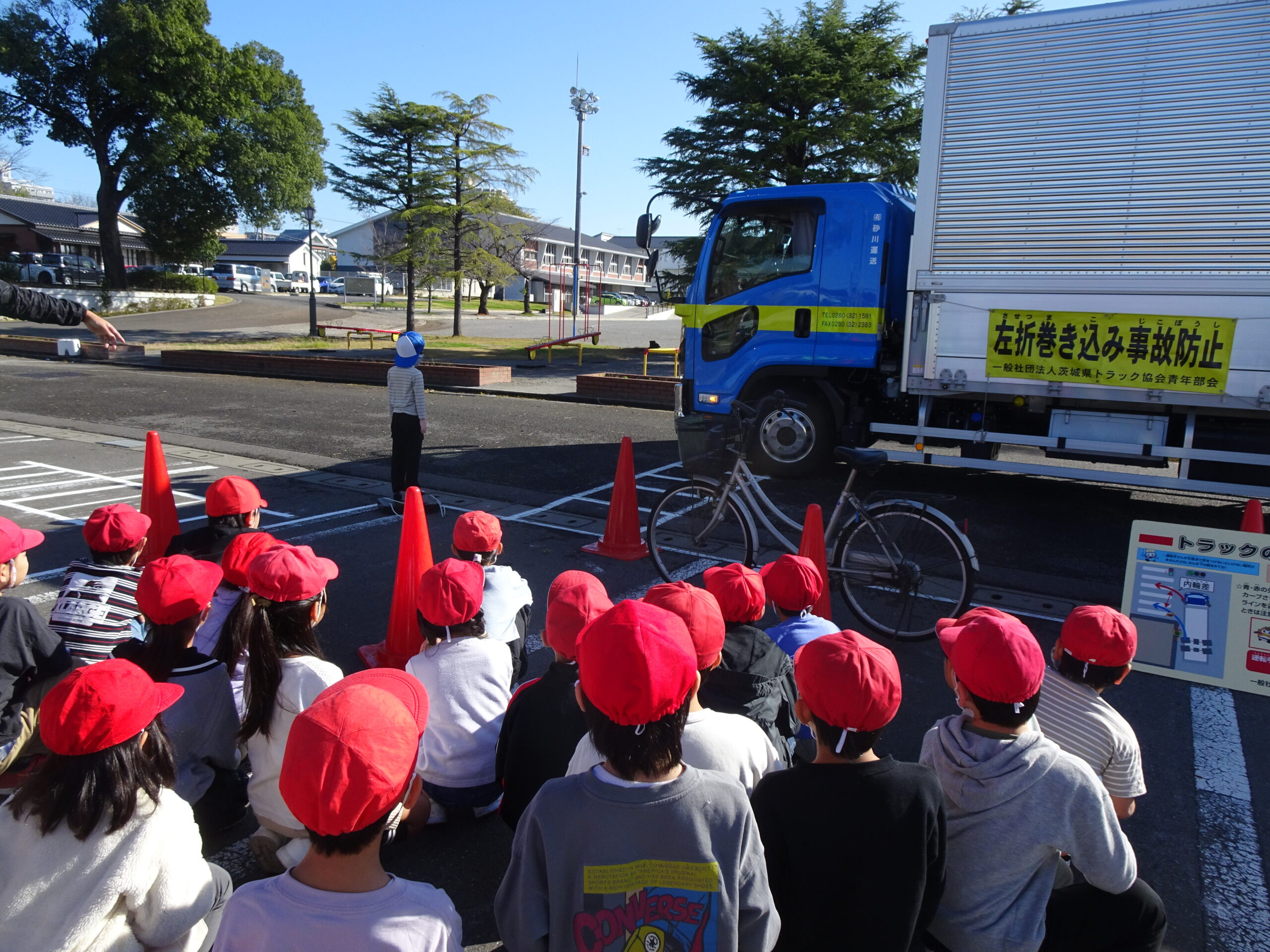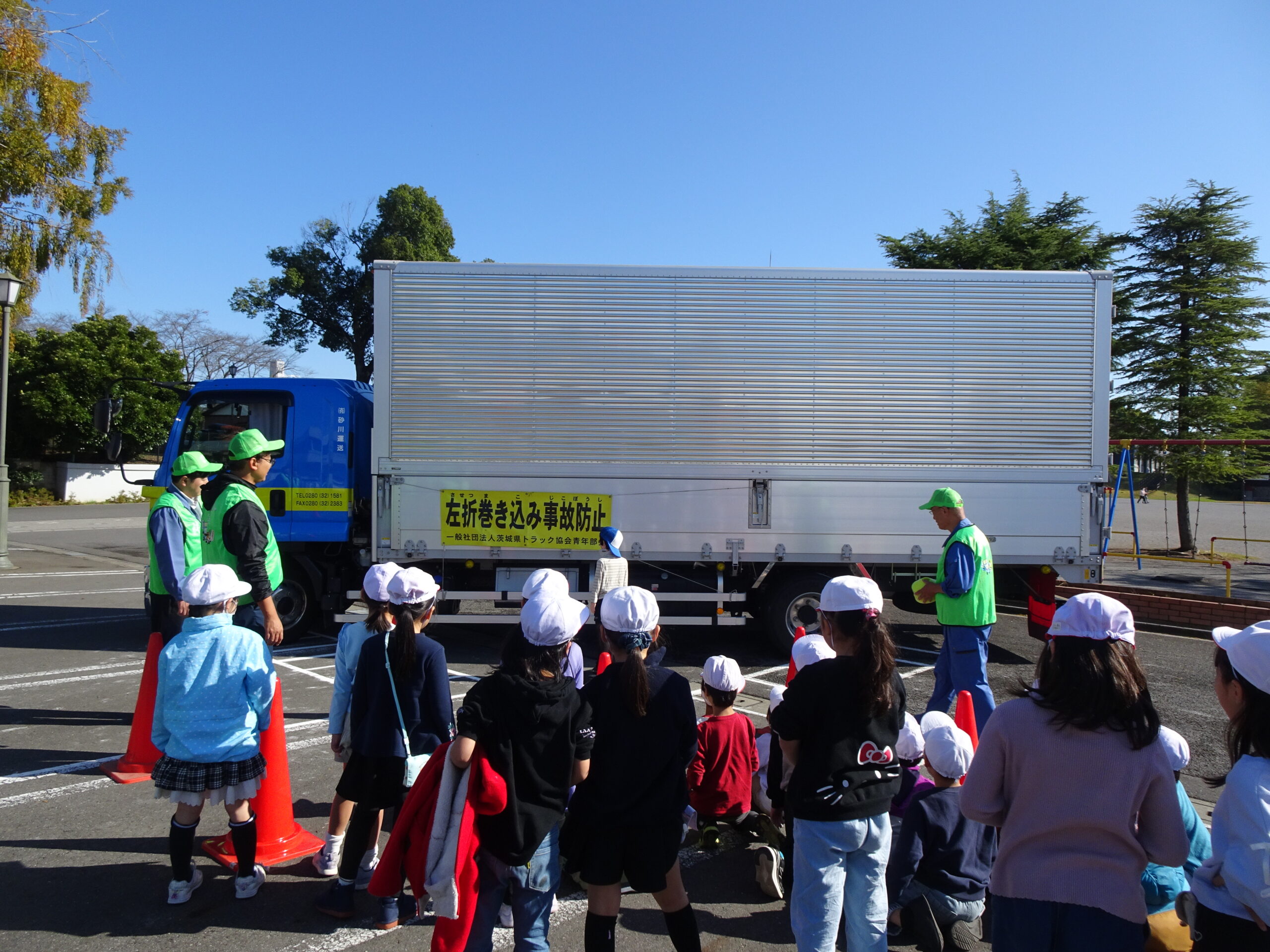 トラック協会の方々に交通安全についてお話を聞きました。 「内輪差」や「死角」といった難しい言葉を、実際にトラックを走らせていただいたり、運転席に乗ったり体験することで、横断歩道でも前にいすぎては危ないこと、運転席から見えない部分があるということを学習することができました。 トラックの荷台に実際に乗ってみると、「高かった」「広かった」との感想がありました。 運転席に実際に乗った感想では、「確かに見えない部分があった」「乗るのが大変」などがありました。 あらためて、交通安全の大切さや登下校で気をつけて歩いていくことを実感する時間となりました。