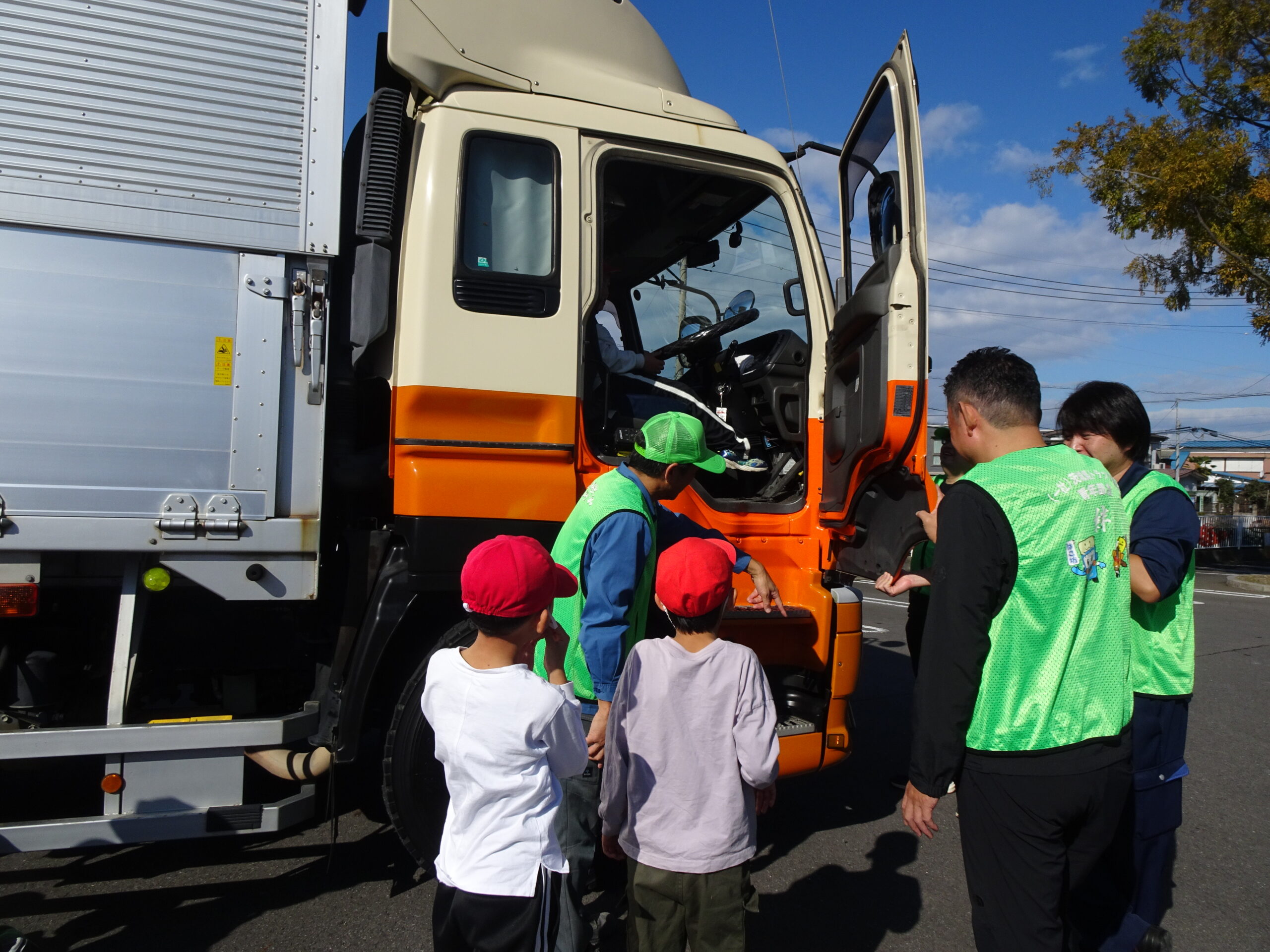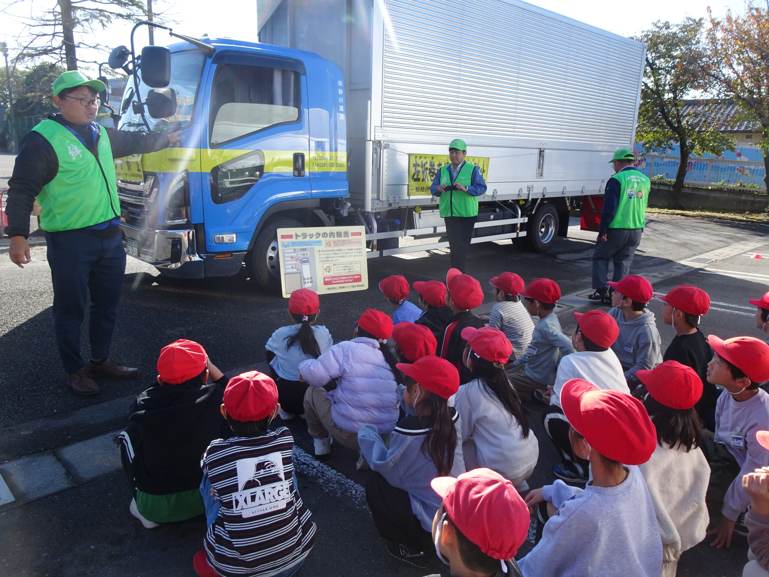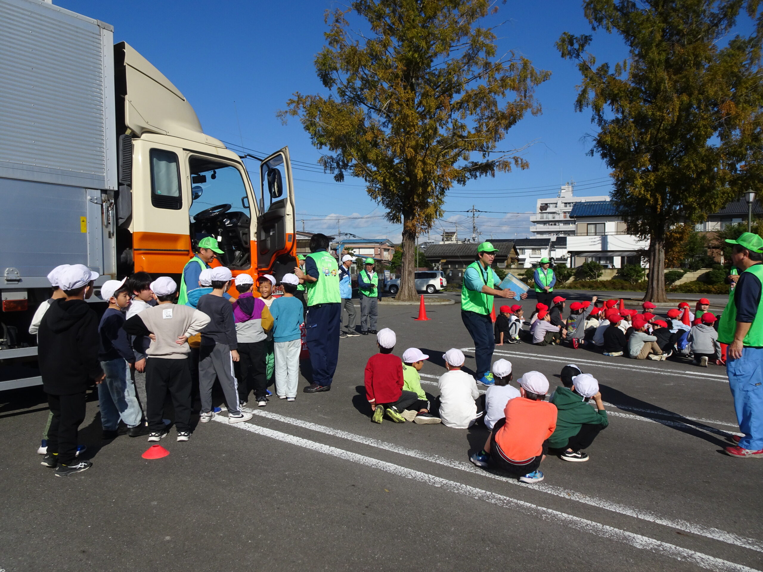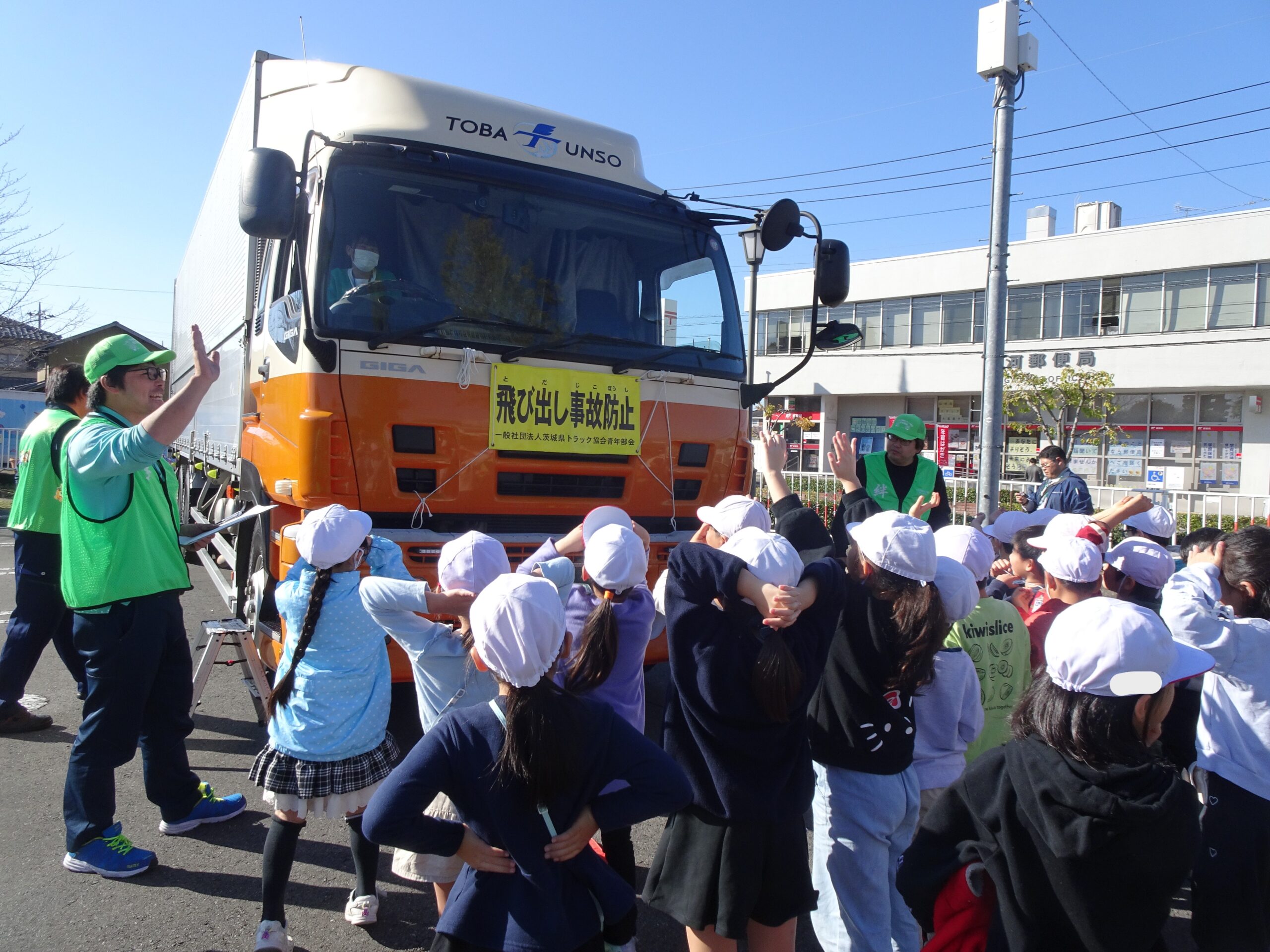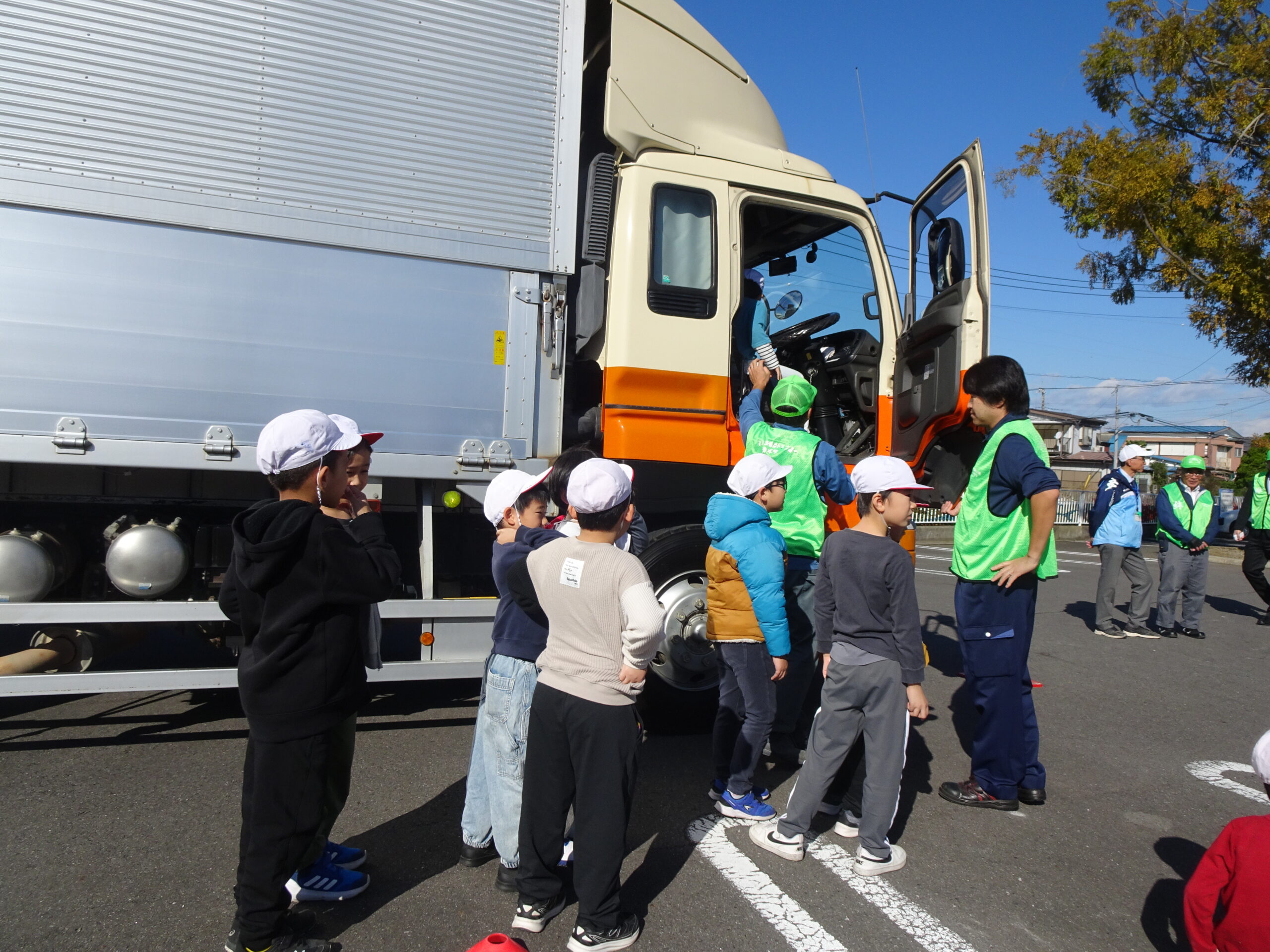 トラック協会の方々に交通安全についてお話を聞きました。 「内輪差」や「死角」といった難しい言葉を、実際にトラックを走らせていただいたり、運転席に乗ったり体験することで、横断歩道でも前にいすぎては危ないこと、運転席から見えない部分があるということを学習することができました。 トラックの荷台に実際に乗ってみると、「高かった」「広かった」との感想がありました。 運転席に実際に乗った感想では、「確かに見えない部分があった」「乗るのが大変」などがありました。 あらためて、交通安全の大切さや登下校で気をつけて歩いていくことを実感する時間となりました。