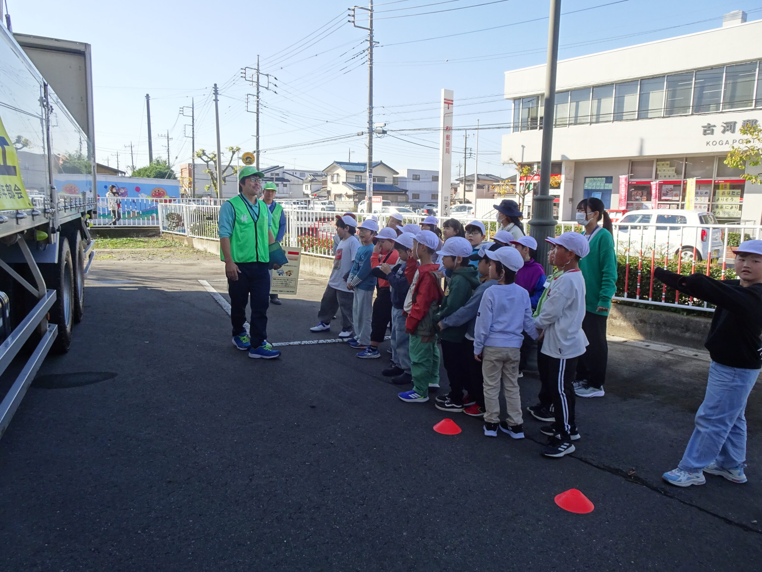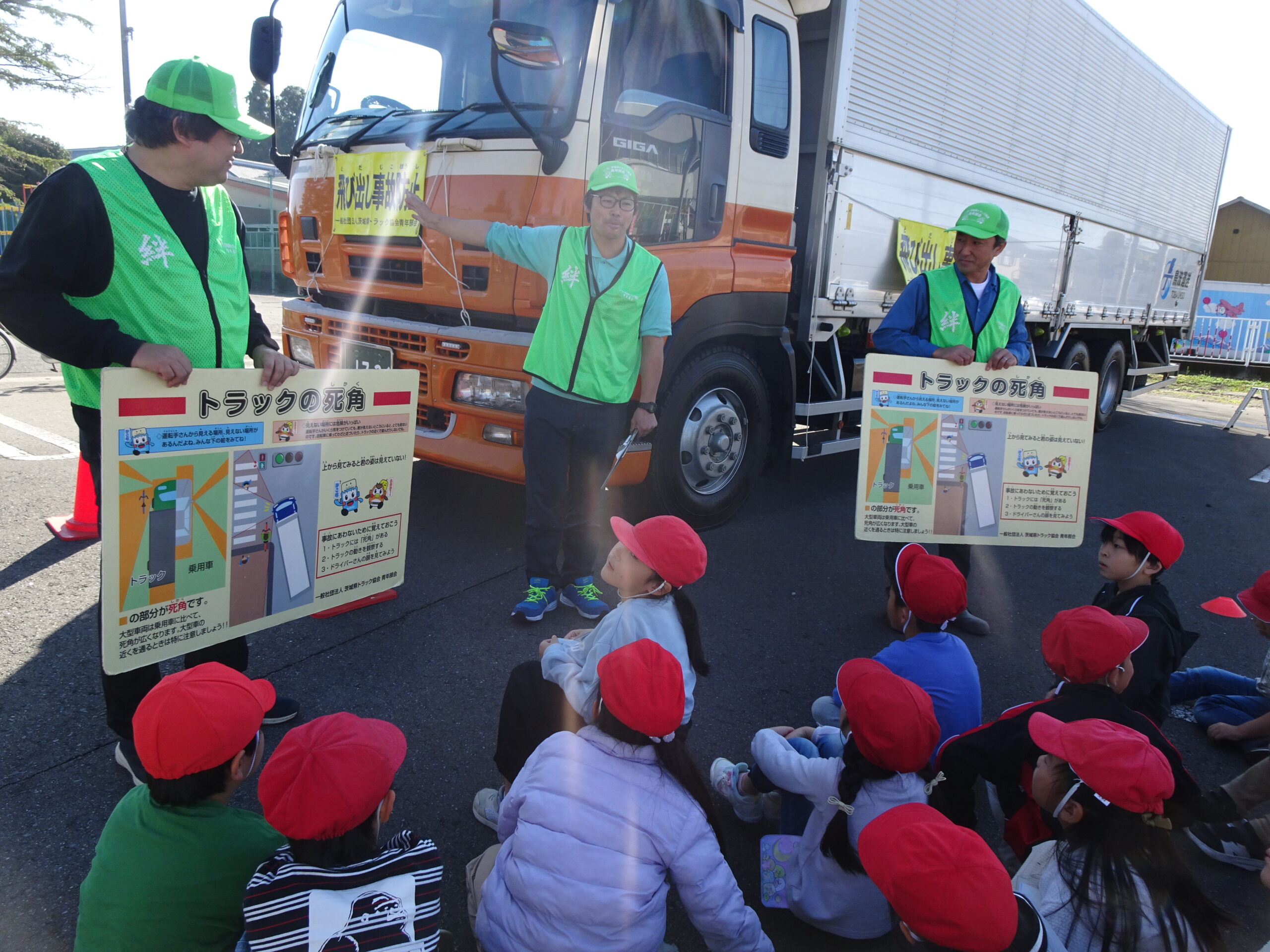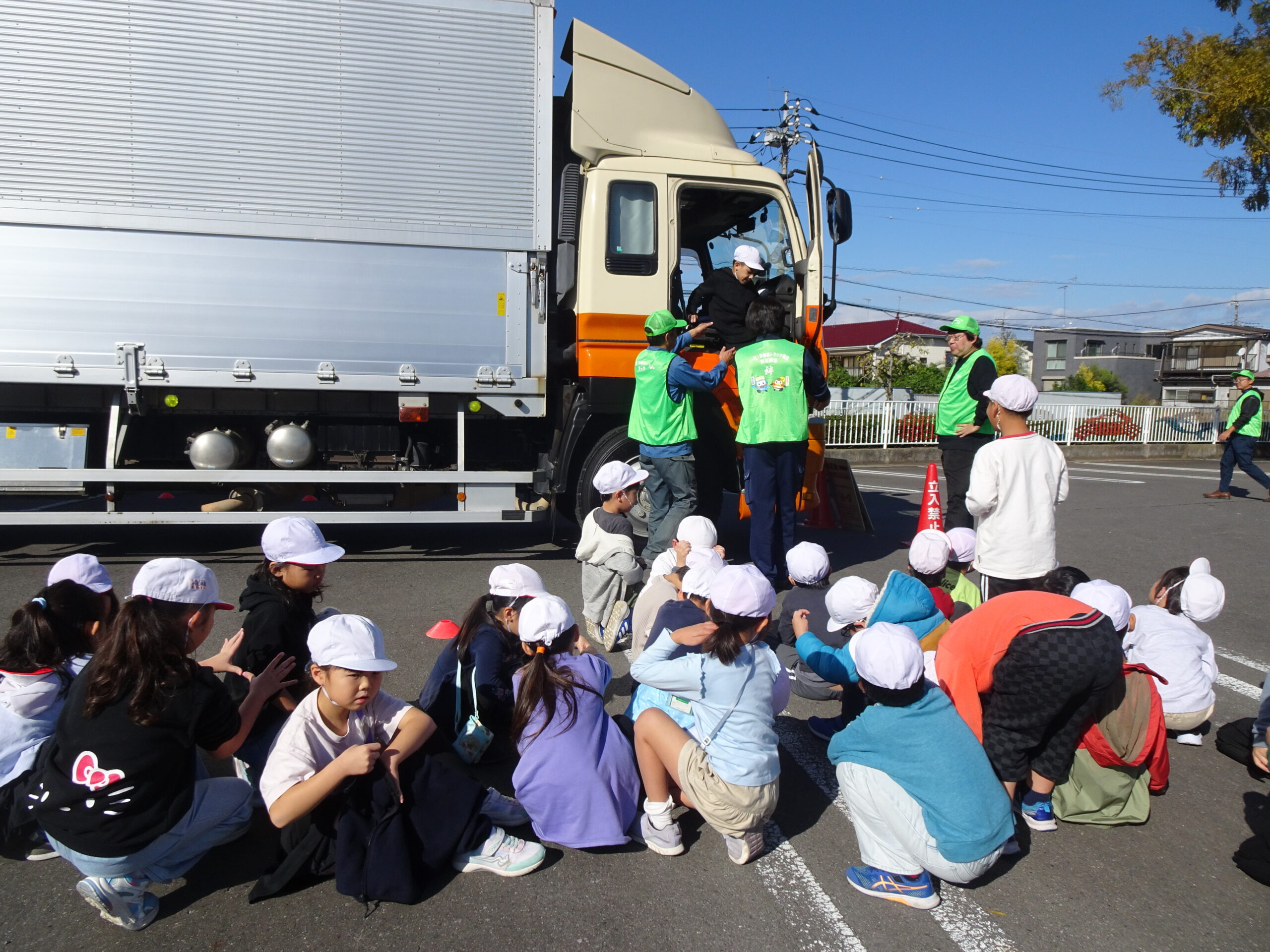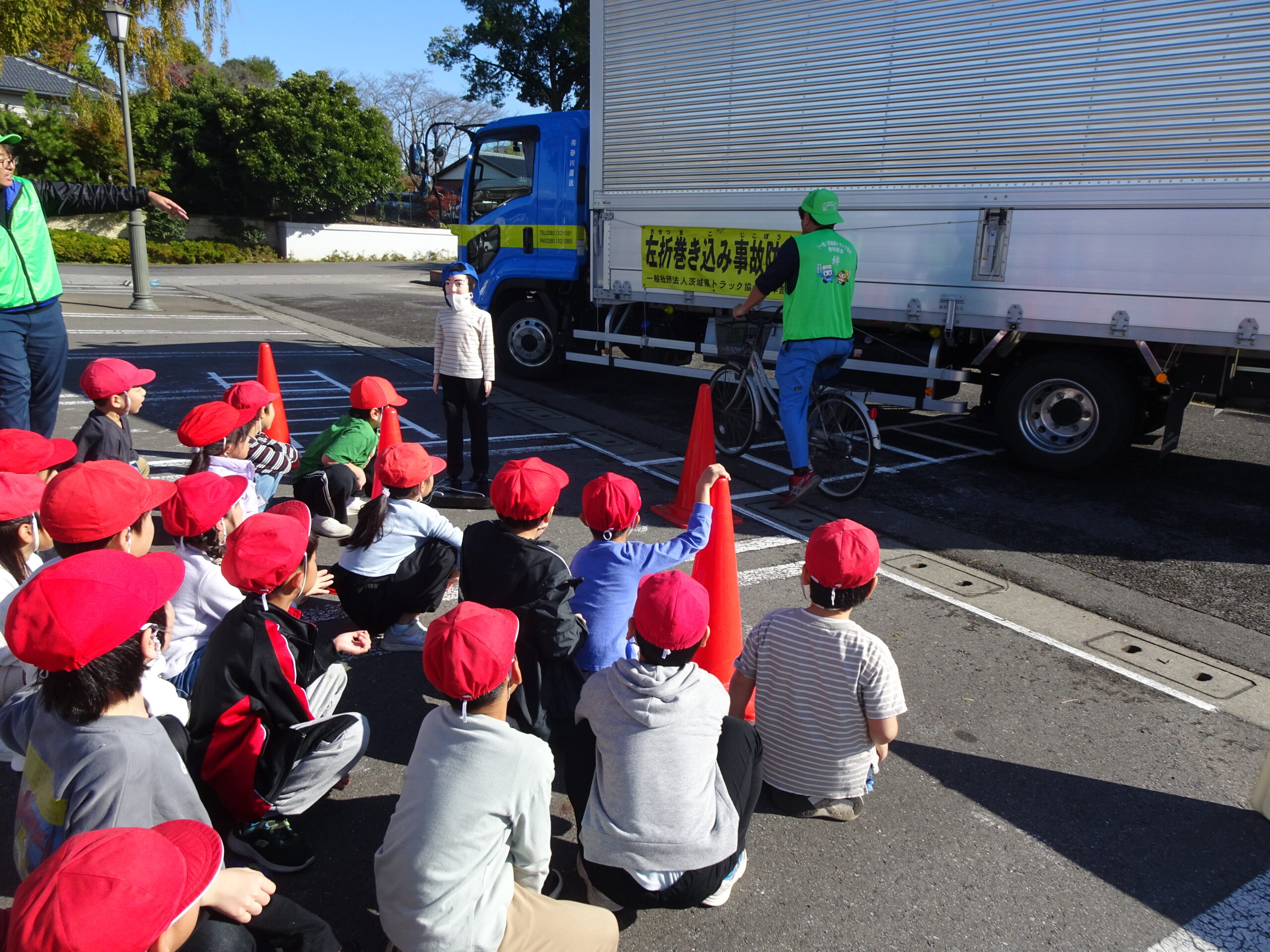 トラック協会の方々に交通安全についてお話を聞きました。 「内輪差」や「死角」といった難しい言葉を、実際にトラックを走らせていただいたり、運転席に乗ったり体験することで、横断歩道でも前にいすぎては危ないこと、運転席から見えない部分があるということを学習することができました。 トラックの荷台に実際に乗ってみると、「高かった」「広かった」との感想がありました。 運転席に実際に乗った感想では、「確かに見えない部分があった」「乗るのが大変」などがありました。 あらためて、交通安全の大切さや登下校で気をつけて歩いていくことを実感する時間となりました。