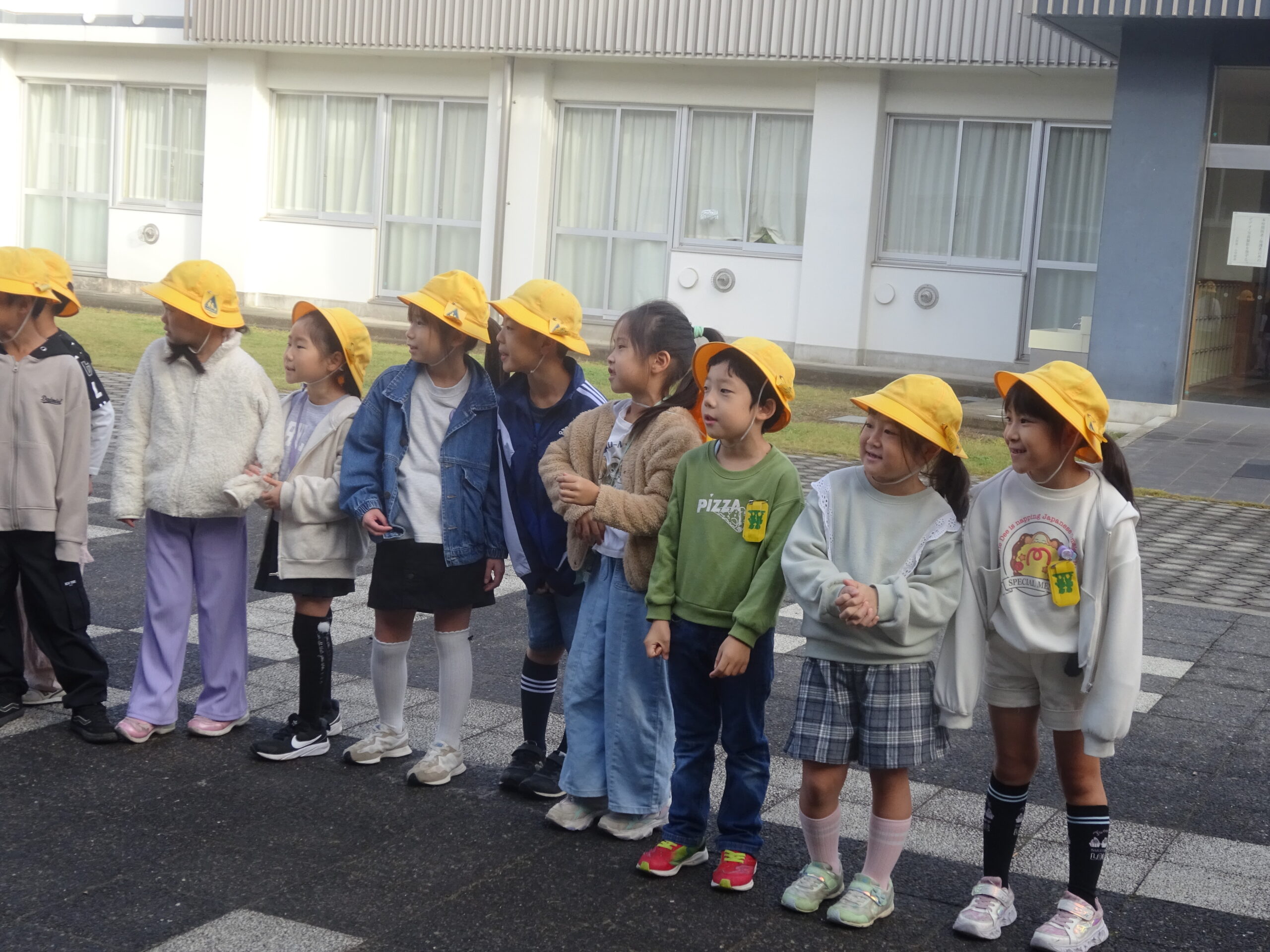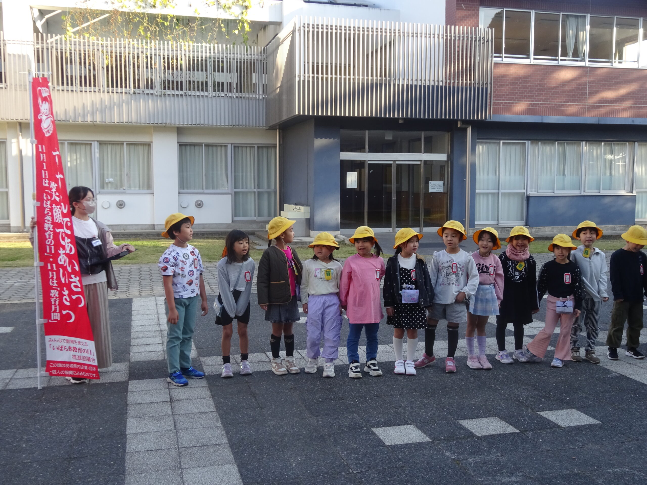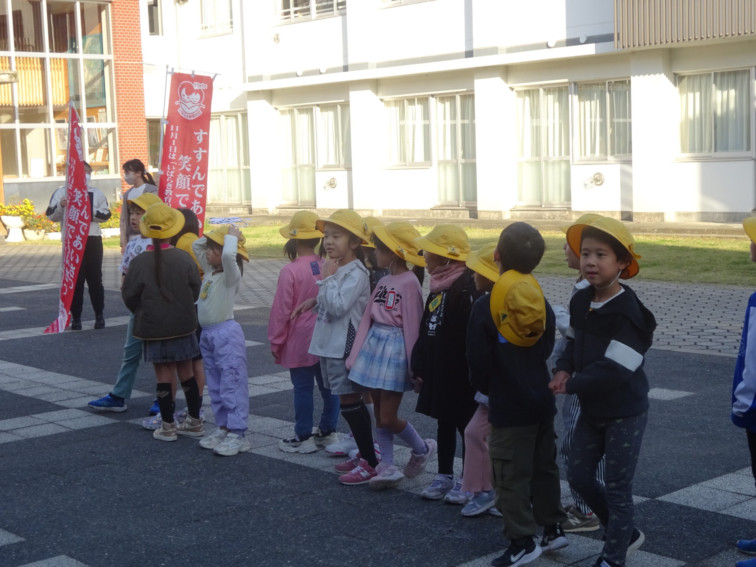 学校全体で行っている秋のあいさつ運動。1年生も、各クラス、当番の日に行いました。登校する児童を見つけると、元気に笑顔であいさつをすることができました。さわやかな朝が迎えられてよかったです☀