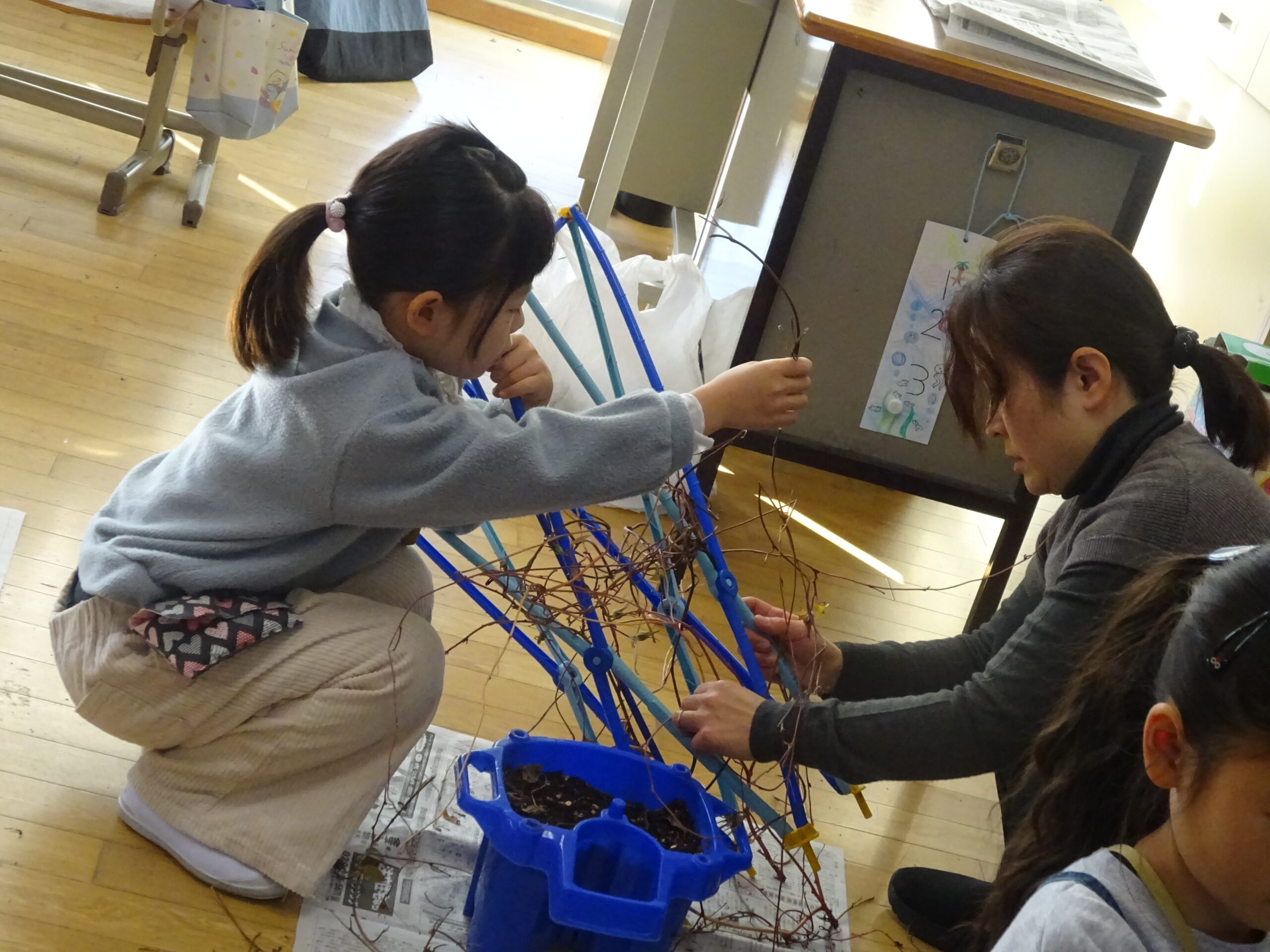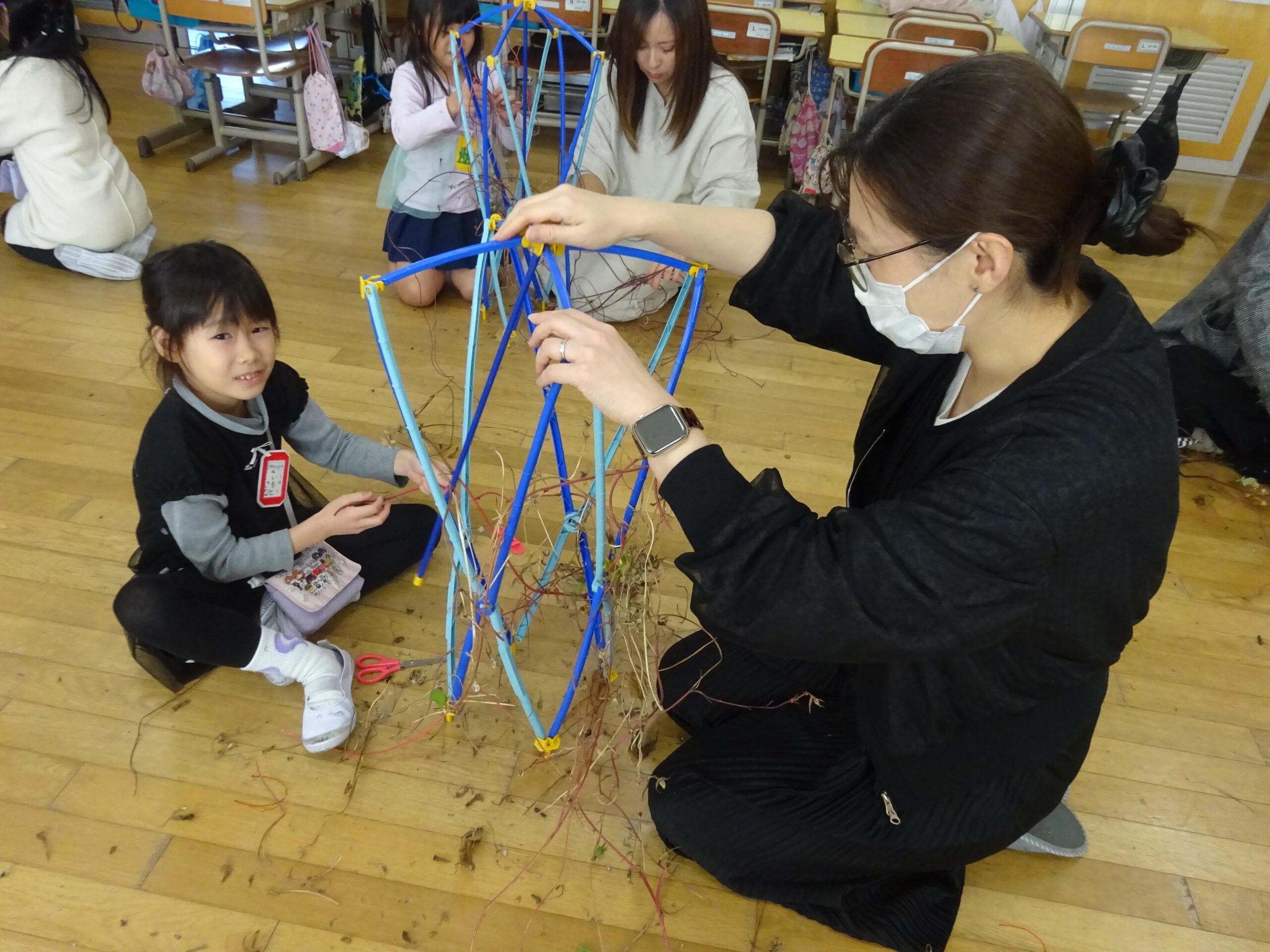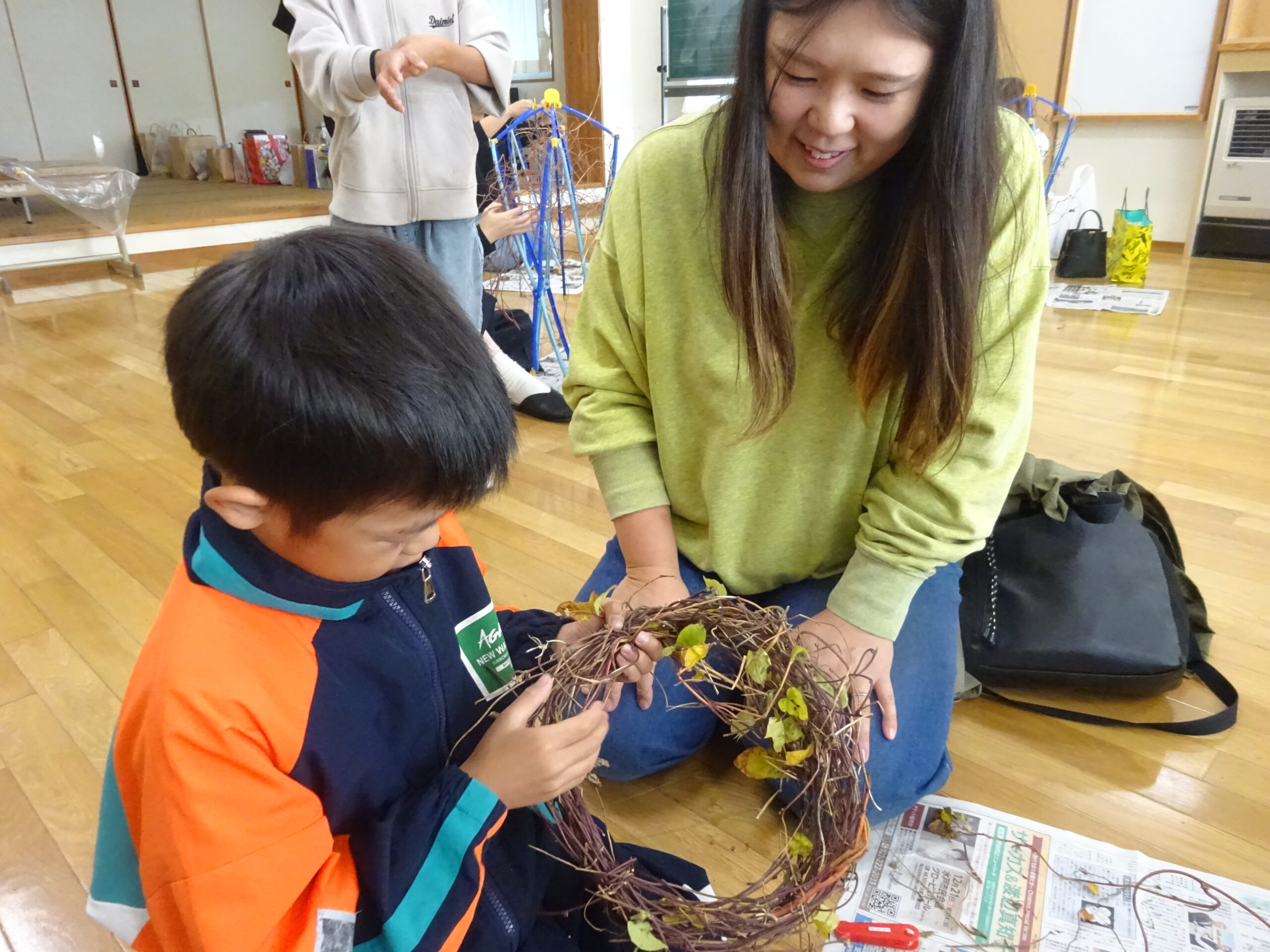 11月14日は親子ふれあい活動を行いました。1年生は、春から育てていたあさがおのツルを使ったクリスマスリースづくり。お家の人と協力して、支柱からあさがおのツルを剥がし、リースの形に成形しました。飾り付けの設計図も、楽しく考えました。 保護者の皆様、お忙しい中、ご来校いただきありがとうございました。素敵なリースが完成しました!