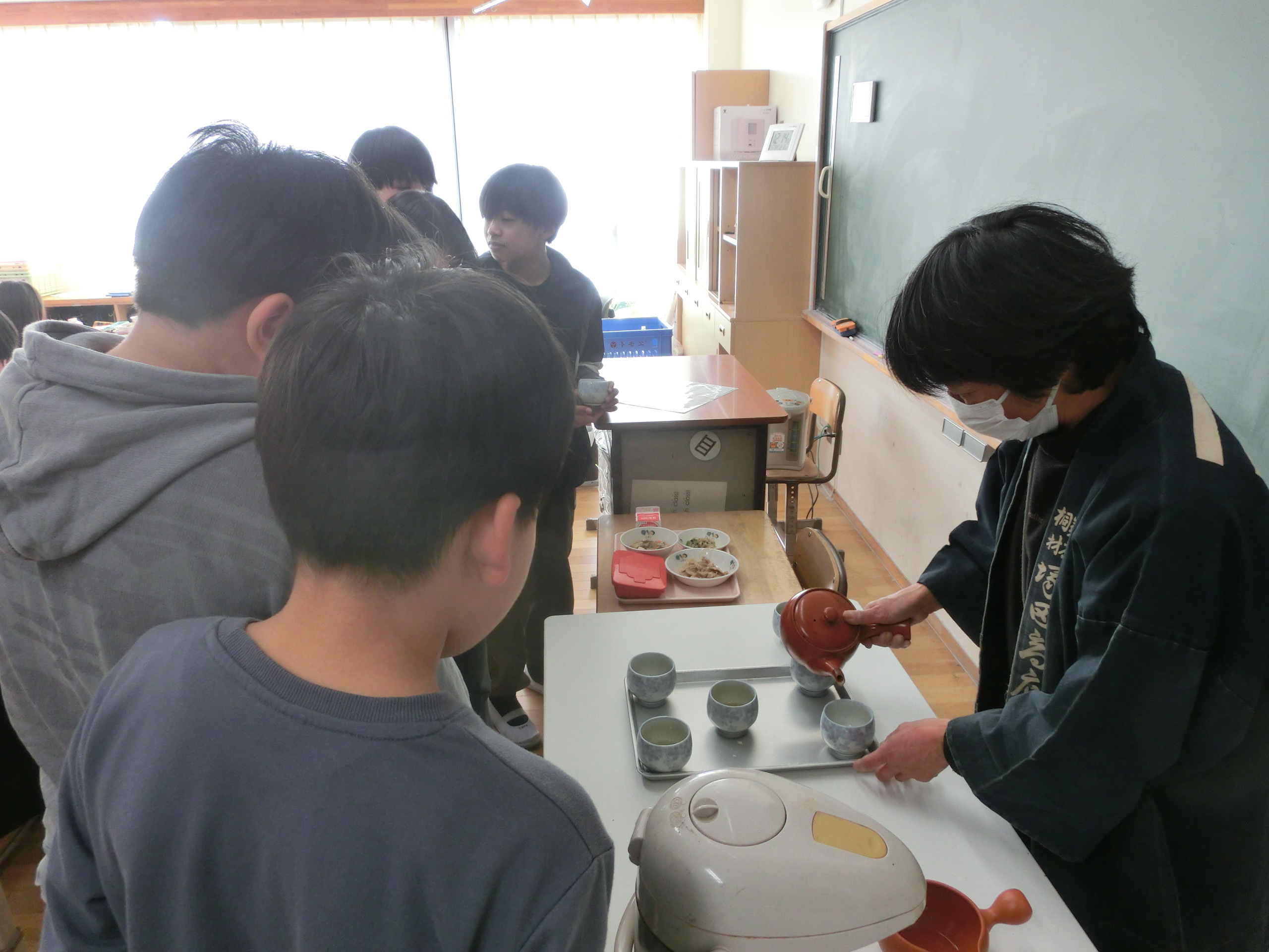 地域の塚田製茶店さんに来ていただき、給食時に緑茶をいただきました。急須でいれるお茶は大変おいしく、たくさんの児童がおかわりをしていました。