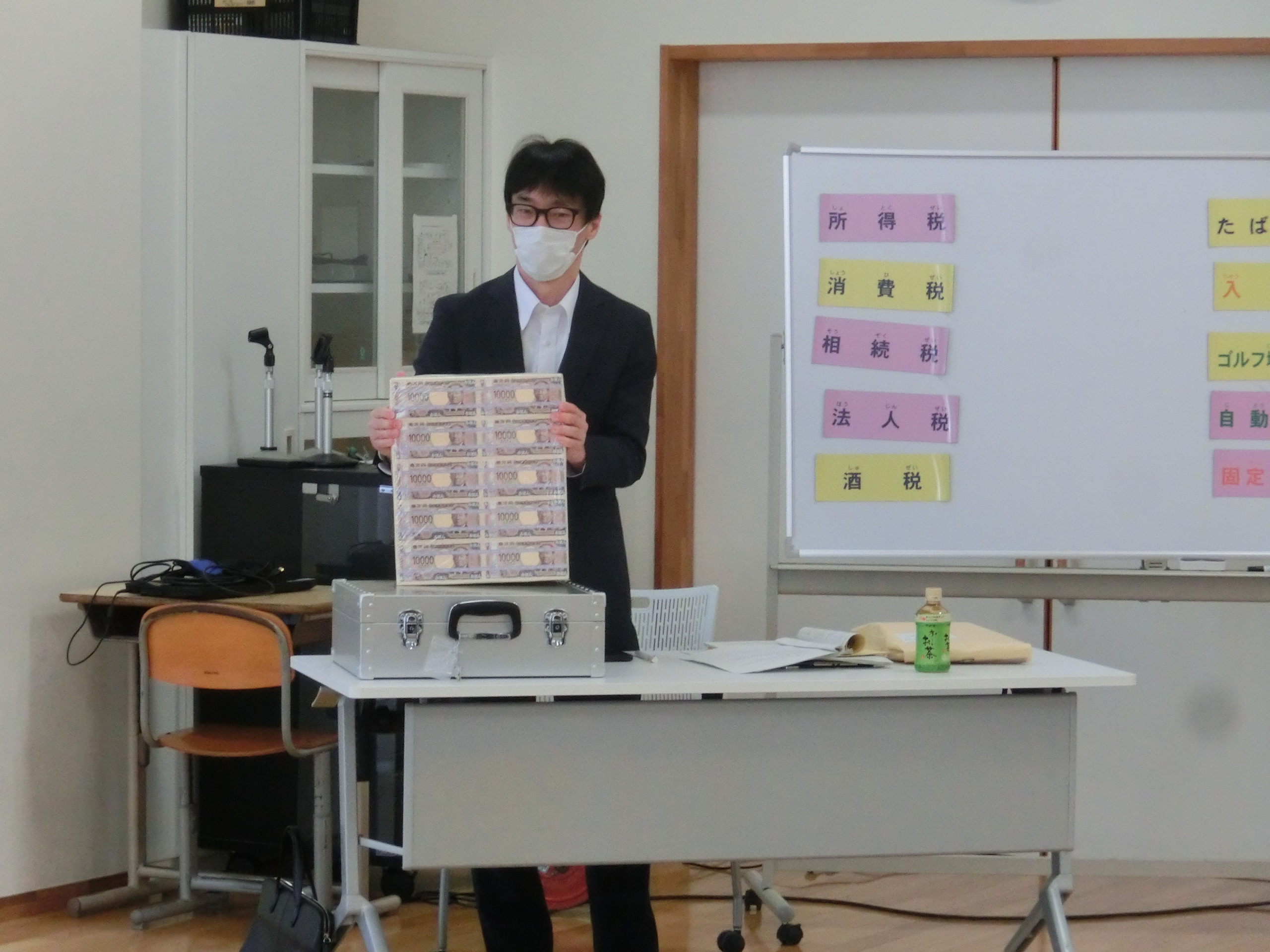 外部講師を招いて、租税教室が行われました。税金がどのように使われているか、税金がなくなるとどうなるのかを学習し、税金の必要性を理解することができました。