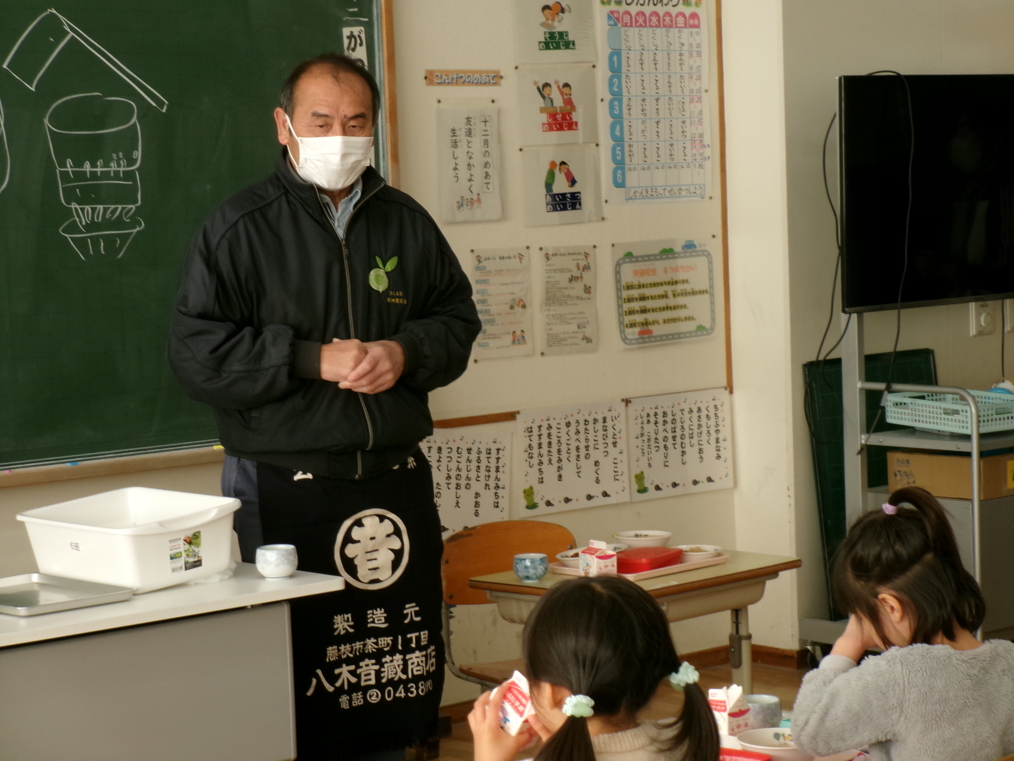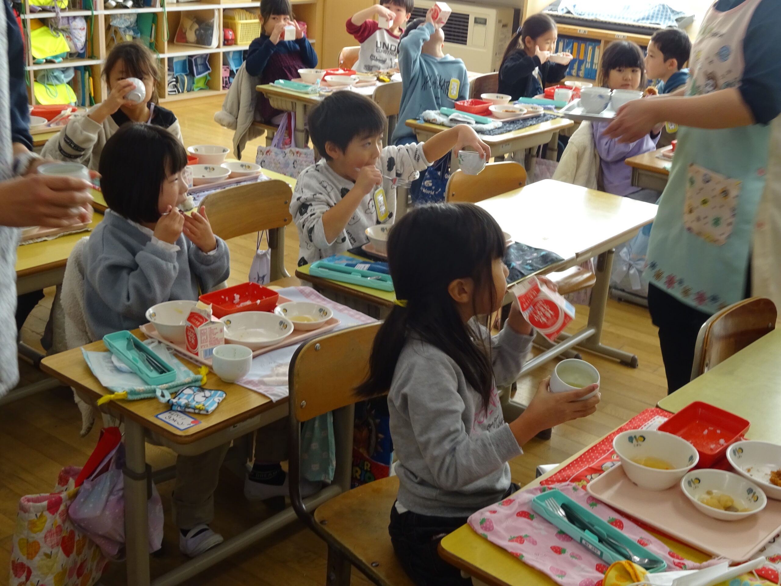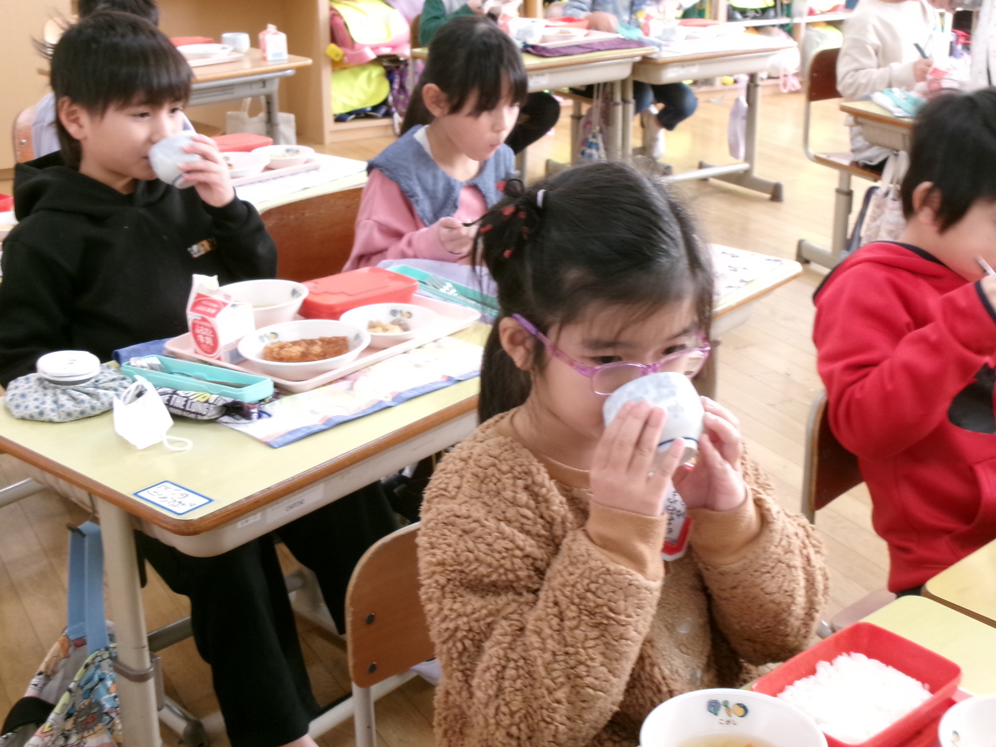 12/18に、本校学区内の塚田製茶店の方にご来校いただき、給食に合わせてお茶を提供していただきました。両手で湯飲みを上手に持って、ゆっくり味わいながら美味しくいただいていました。