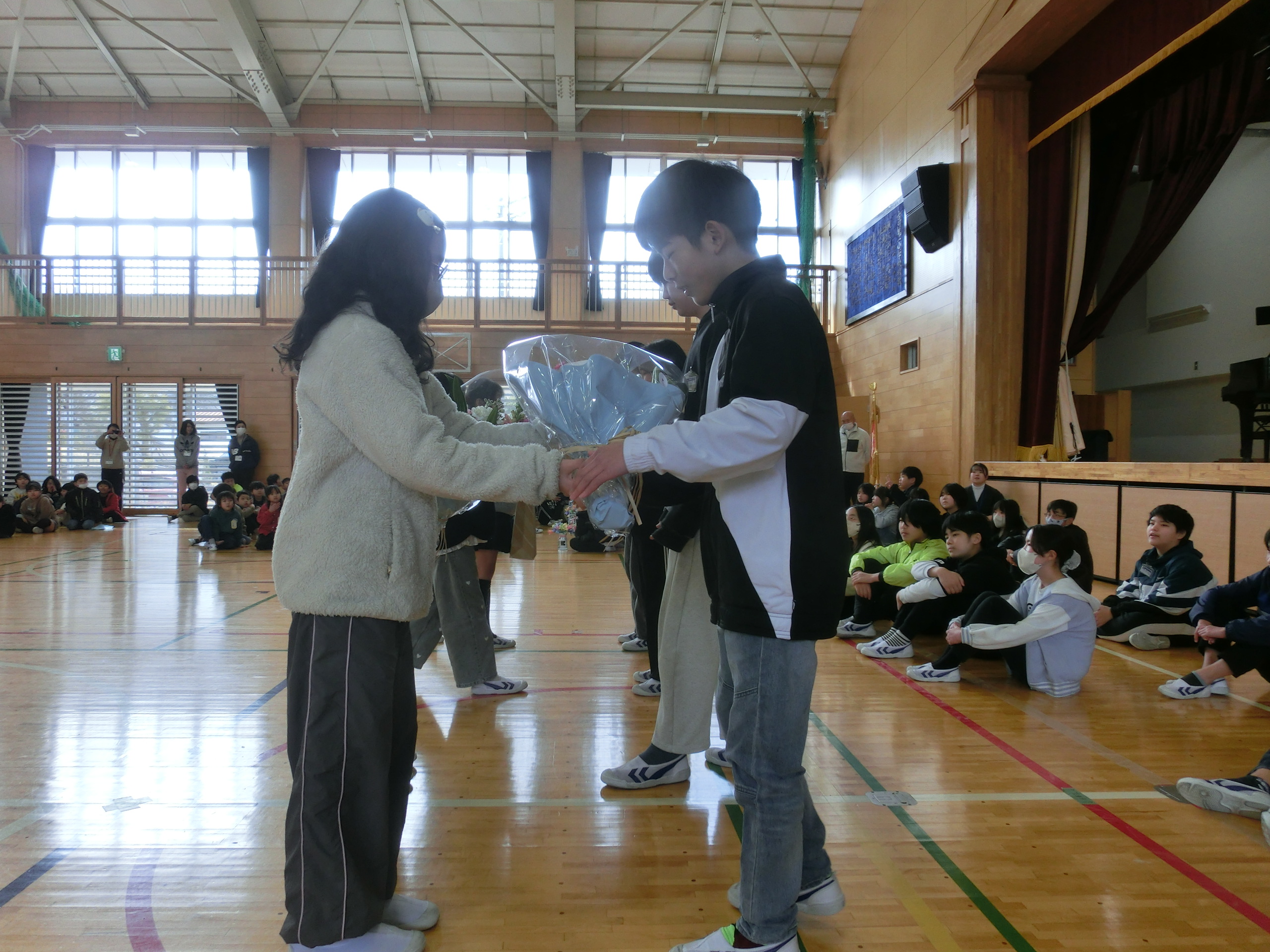 花束と卒業記念品の贈呈。6年生からの記念品の贈呈。