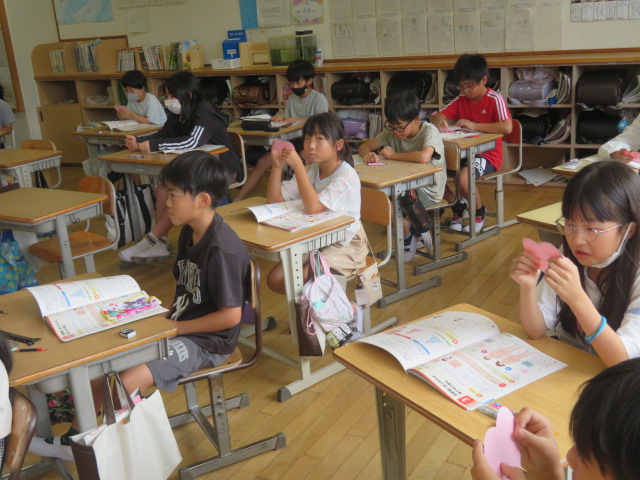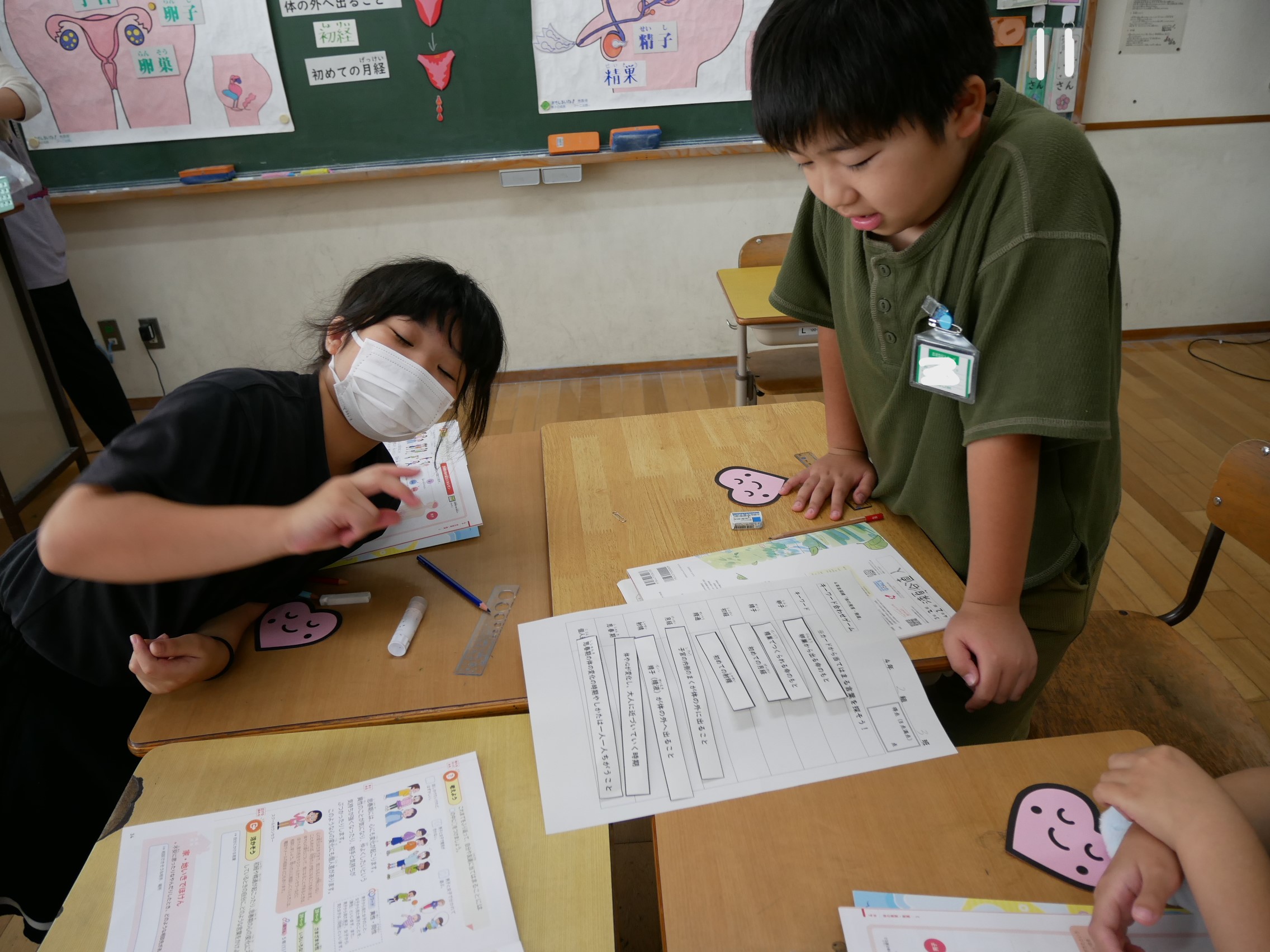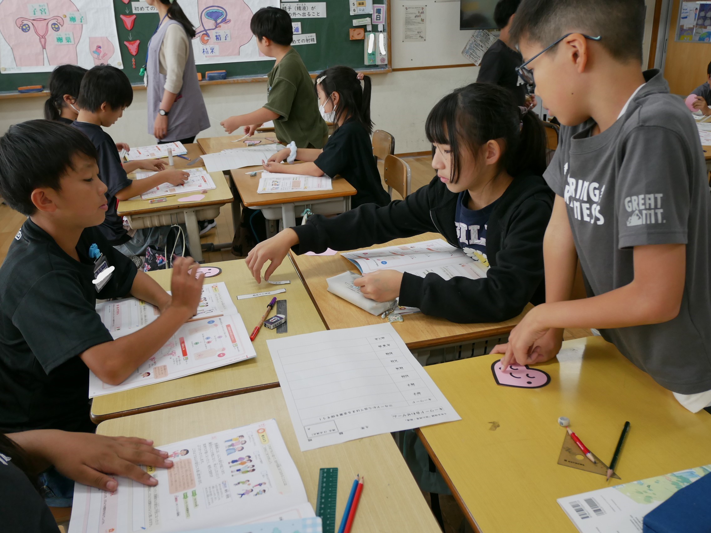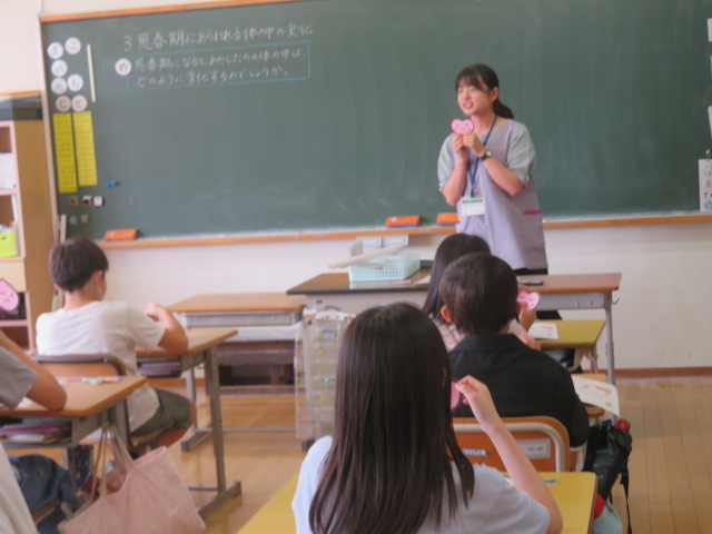 保健の時間に「体の発育・発達」を学習しました。養護教諭の小川先生と一緒に、体の成長の仕組みを学び、それとどう向き合っていけばよいか考えました。